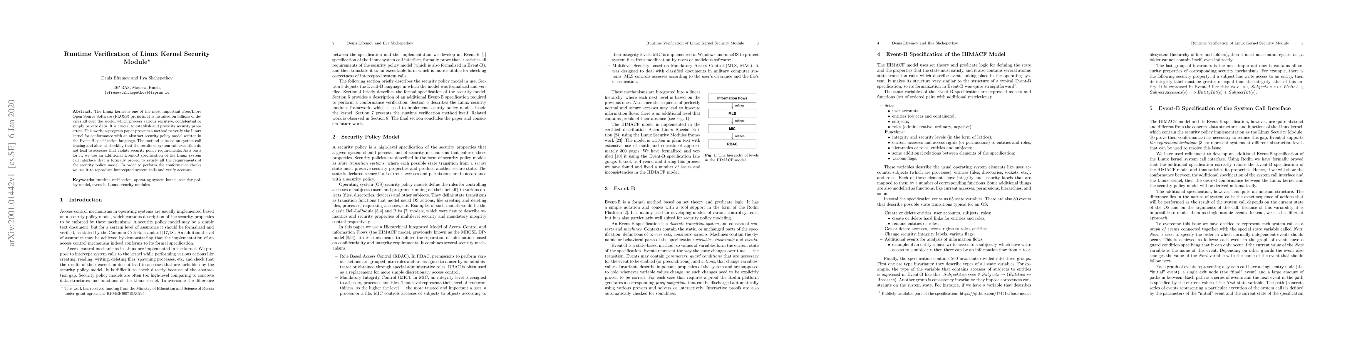 This paper proposes a method for runtime verification of the Linux kernel's security properties using system call tracing and an Event-B specification model. The method checks if system call executions adhere to a predefined security policy, ensuring no unauthorized access occurs.