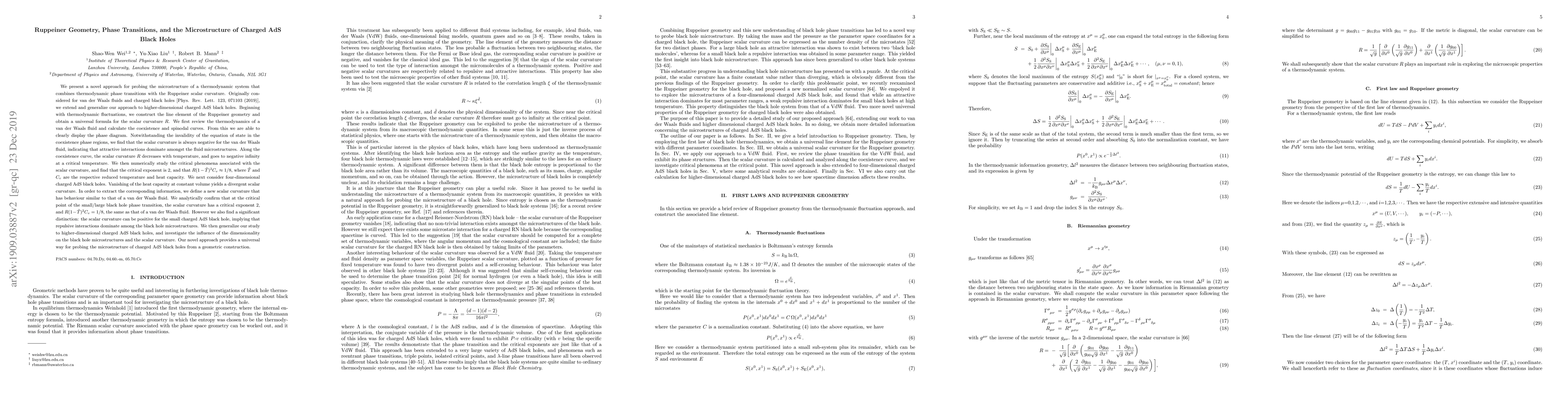 Originally considered for van der Waals fluids and charged black holes [Phys. Rev. Lett. 123, 071103 (2019)], we extend and generalize our approach to higher-dimensional charged AdS black holes. Beginning with thermodynamic fluctuations, we construct the line element of the Ruppeiner geometry and obtain a universal formula for the scalar curvature $R$. We first review the thermodynamics of a van der Waals fluid and calculate the coexistence and spinodal curves. From this we are able to clearly display the phase diagram. Notwithstanding the invalidity of the equation of state in the coexistence phase regions, we find that the scalar curvature is always negative for the van der Waals fluid, indicating that attractive interactions dominate amongst the fluid microstructures. Along the coexistence curve, the scalar curvature $R$ decreases with temperature, and goes to negative infinity at a critical temperature. We then numerically study the critical phenomena associated with the scalar curvature. We next consider four-dimensional charged AdS black holes. Vanishing of the heat capacity at constant volume yields a divergent scalar curvature. In order to extract the corresponding information, we define a new scalar curvature that has behaviour similar to that of a van der Waals fluid. We analytically confirm that at the critical point of the small/large black hole phase transition, the scalar curvature has a critical exponent 2, and $R(1-\tilde{T})^{2}C_{v}=1/8$, the same as that of a van der Waals fluid. However we also find that the scalar curvature can be positive for the small charged AdS black hole, implying that repulsive interactions dominate among the black hole microstructures. We then generalize our study to higher-dimensional charged AdS black holes.