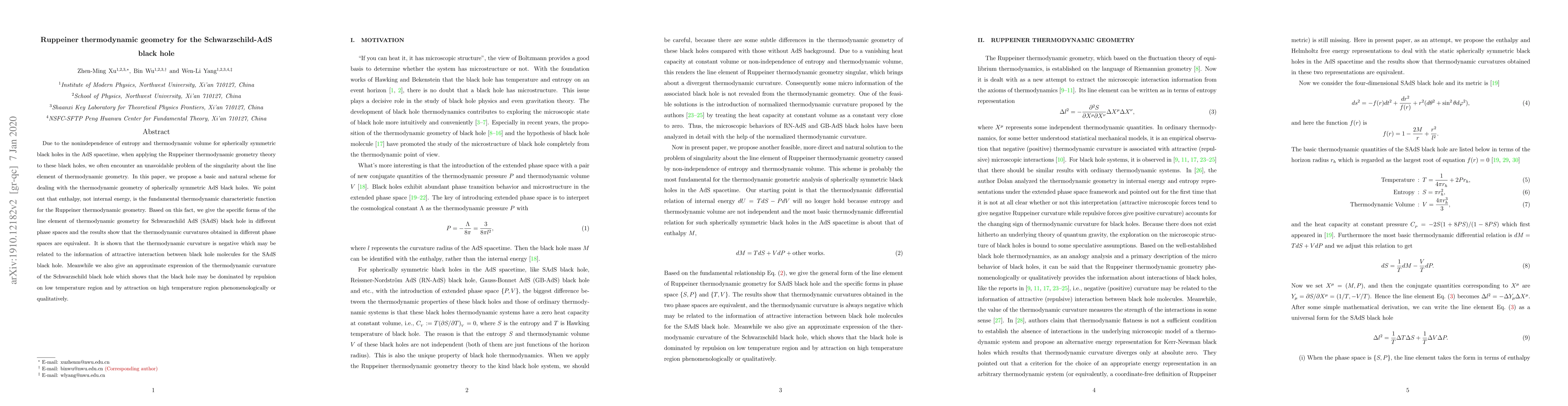 This paper proposes a method to address singularities in thermodynamic geometry for Schwarzschild-AdS black holes, identifying enthalpy as the primary characteristic function. It demonstrates equivalent thermodynamic curvatures across different phase spaces, showing that the SAdS black hole exhibits attractive interactions. Additionally, it finds that Schwarzschild black holes display repulsion at low temperatures and attraction at high temperatures.