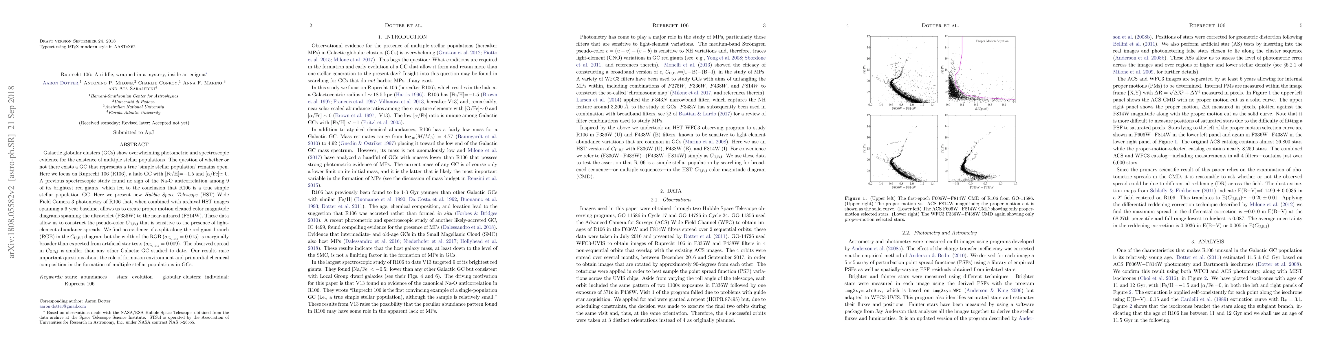 Galactic globular clusters (GCs) show overwhelming photometric and spectroscopic evidence for the existence of multiple stellar populations. The question of whether or not there exists a GC that represents a true 'simple stellar population' remains open. Here we focus on Ruprecht 106 (R106), a halo GC with [Fe/H]=-1.5 and [alpha/Fe]~0. A previous spectroscopic study found no sign of the Na-O anticorrelation among 9 of its brightest red giants, which led to the conclusion that R106 is a true simple stellar population GC. Here we present new Hubble Space Telescope (HST) Wide Field Camera 3 photometry of R106 that, when combined with archival HST images spanning a 6-year baseline, allows us to create proper motion cleaned color-magnitude diagrams spanning the ultraviolet (F336W) to the near-infrared (F814W). These data allow us to construct the pseudo-color C_{U,B,I} that is sensitive to the presence of light-element abundance spreads. We find no evidence of a split along the red giant branch (RGB) in the C_{U,B,I} diagram but the width of the RGB (sigma_CUBI = 0.015) is marginally broader than expected from artificial star tests (sigma_CUBI = 0.009). The observed spread in C_{U,B,I} is smaller than any other Galactic GC studied to date. Our results raise important questions about the role of formation environment and primordial chemical composition in the formation of multiple stellar populations in GCs.