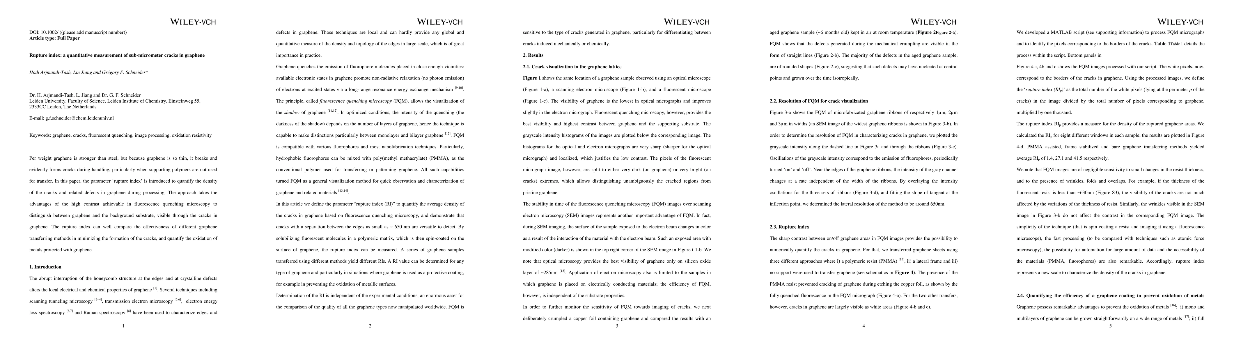 The rupture index quantitatively measures the density of sub-micrometer cracks in graphene, utilizing fluorescence quenching microscopy for high contrast. This index helps compare the effectiveness of various graphene transfer methods and assesses the protective qualities of graphene against metal oxidation.