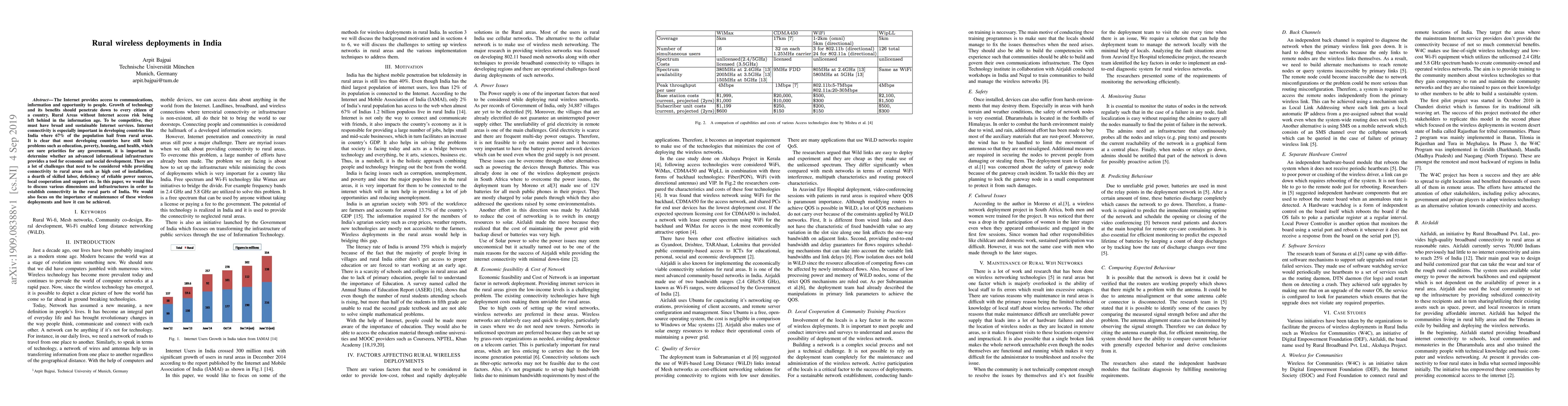 This paper explores the challenges and strategies for deploying rural wireless Internet in India, emphasizing the importance of connectivity for economic and social development amidst issues like high installation costs, lack of skilled labor, and unreliable power sources. It also discusses the necessity of sustainable maintenance for these deployments.