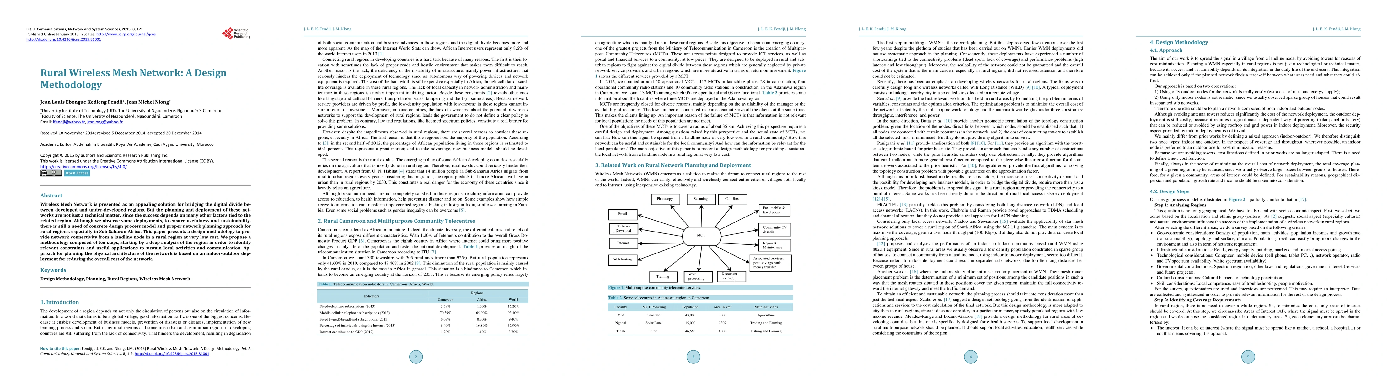 This paper proposes a ten-step design methodology for deploying low-cost wireless mesh networks in rural areas, particularly in Sub-Saharan Africa, focusing on regional constraints and applications to enhance local connectivity and sustainability. The methodology emphasizes an indoor-outdoor network architecture to minimize costs.