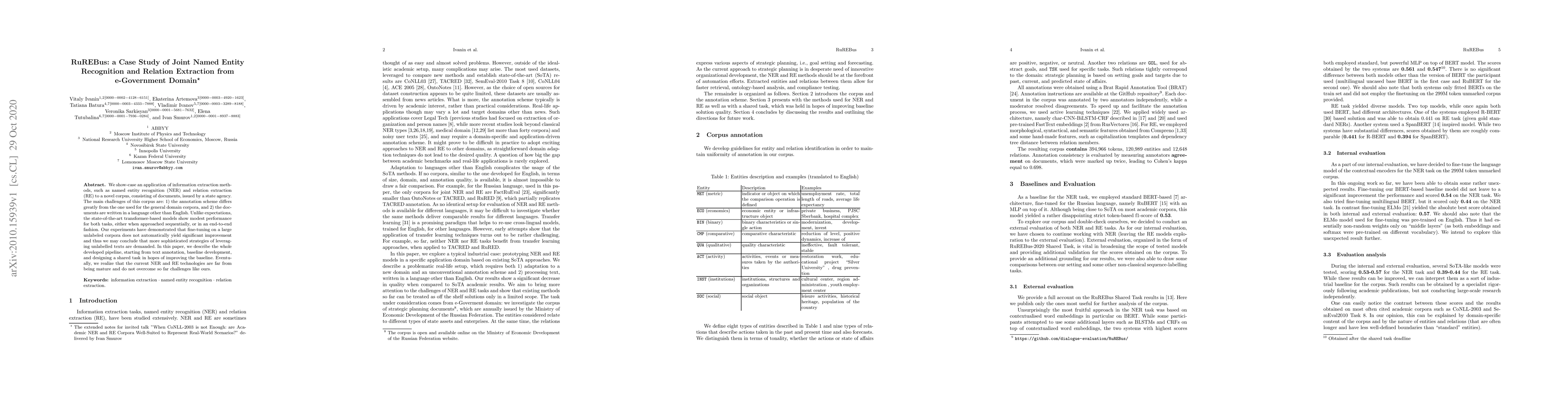 We show-case an application of information extraction methods, such as named entity recognition (NER) and relation extraction (RE) to a novel corpus, consisting of documents, issued by a state agency. The main challenges of this corpus are: 1) the annotation scheme differs greatly from the one used for the general domain corpora, and 2) the documents are written in a language other than English. Unlike expectations, the state-of-the-art transformer-based models show modest performance for both tasks, either when approached sequentially, or in an end-to-end fashion. Our experiments have demonstrated that fine-tuning on a large unlabeled corpora does not automatically yield significant improvement and thus we may conclude that more sophisticated strategies of leveraging unlabelled texts are demanded. In this paper, we describe the whole developed pipeline, starting from text annotation, baseline development, and designing a shared task in hopes of improving the baseline. Eventually, we realize that the current NER and RE technologies are far from being mature and do not overcome so far challenges like ours.