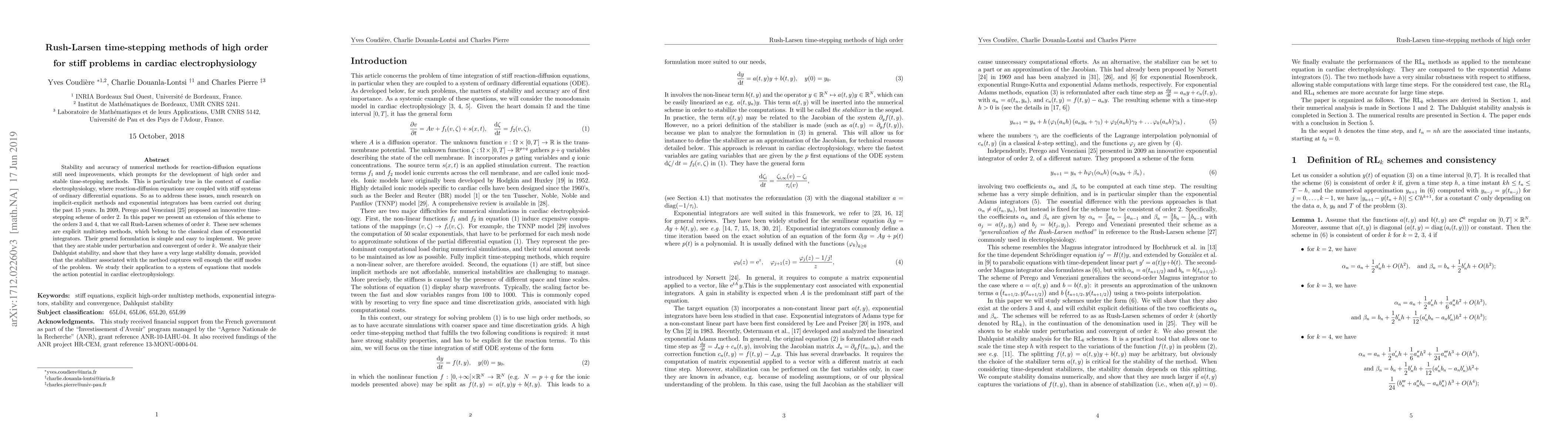 This paper extends the Rush-Larsen time-stepping methods to orders 3 and 4, introducing RL_k schemes as explicit multistep exponential integrators for solving stiff problems in cardiac electrophysiology. The RL_k schemes are shown to be stable, convergent, and possess a large stability domain when the stabilizer effectively captures the stiff modes.
