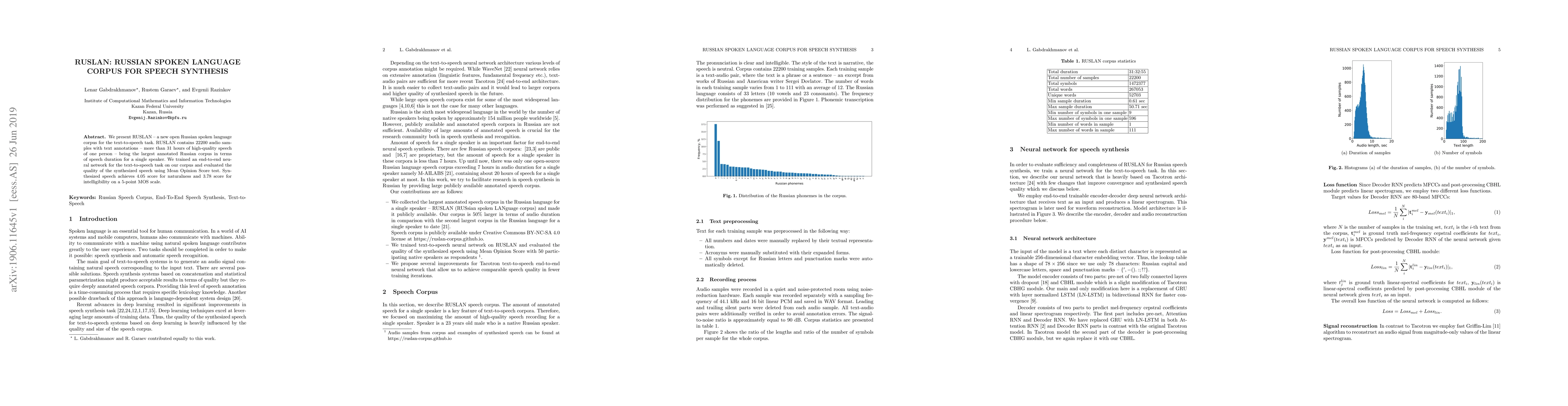 RUSLAN is a large open Russian spoken language corpus comprising 22,200 audio samples from a single speaker, serving as a resource for text-to-speech synthesis. The corpus was used to train a neural network model, which achieved a Mean Opinion Score of 4.05 for naturalness and 3.78 for intelligibility.