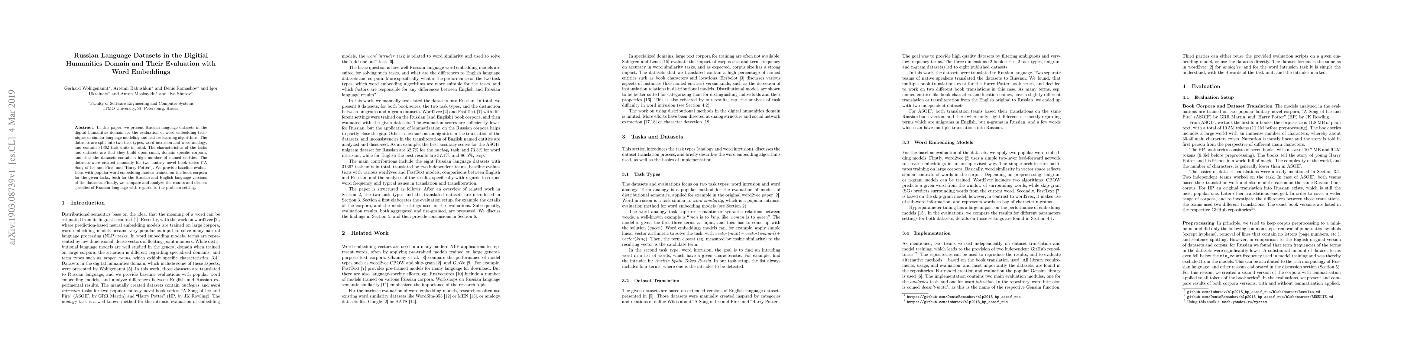This paper introduces Russian language datasets for digital humanities, focusing on word intrusion and analogy tasks, and evaluates them using word embeddings. The datasets, derived from fantasy novels, include a high number of named entities and are manually curated. Baseline evaluations with popular word embeddings are provided, comparing Russian and English versions.