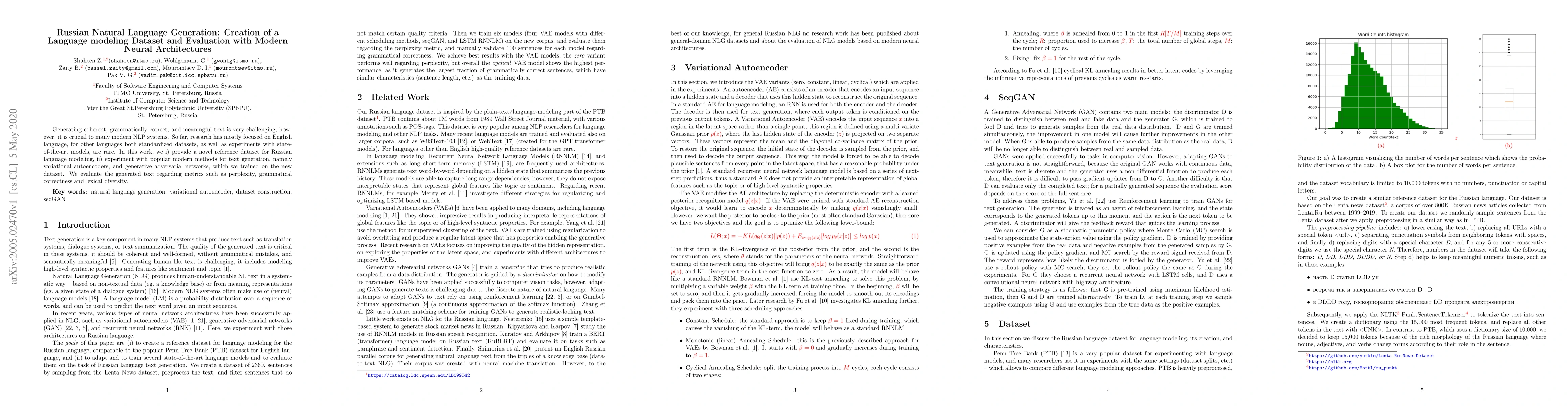 Generating coherent, grammatically correct, and meaningful text is very challenging, however, it is crucial to many modern NLP systems. So far, research has mostly focused on English language, for other languages both standardized datasets, as well as experiments with state-of-the-art models, are rare. In this work, we i) provide a novel reference dataset for Russian language modeling, ii) experiment with popular modern methods for text generation, namely variational autoencoders, and generative adversarial networks, which we trained on the new dataset. We evaluate the generated text regarding metrics such as perplexity, grammatical correctness and lexical diversity.