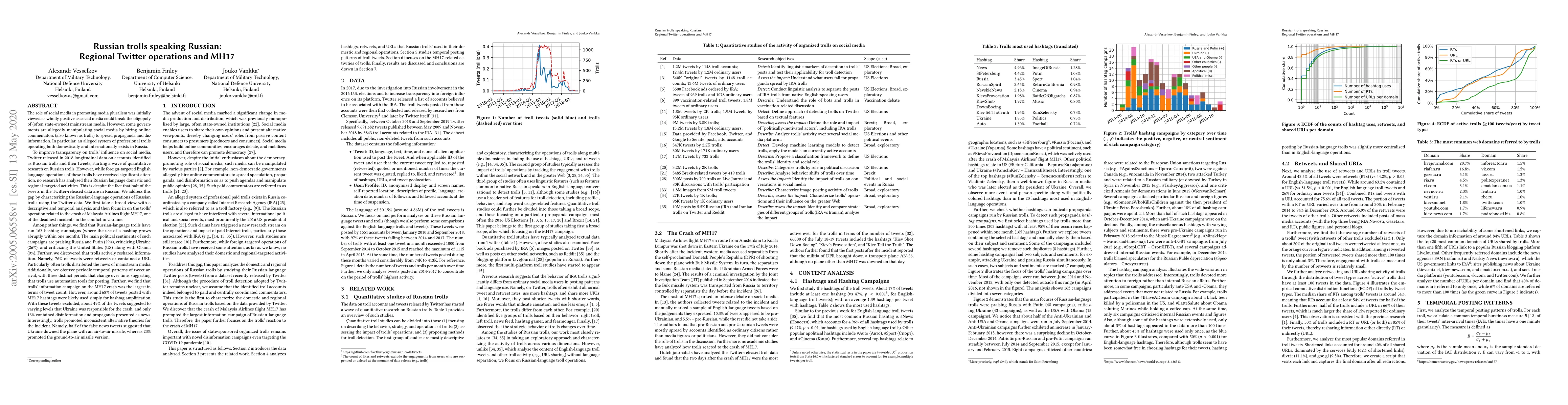 Researchers analyzed Russian trolls' operations on Twitter in Russia, finding they ran 163 hashtag campaigns with a focus on praising Putin and criticizing Ukraine and the US. These trolls promoted inconsistent theories about the MH17 crash, suggesting that around half of their tweets contained disinformation or propaganda.