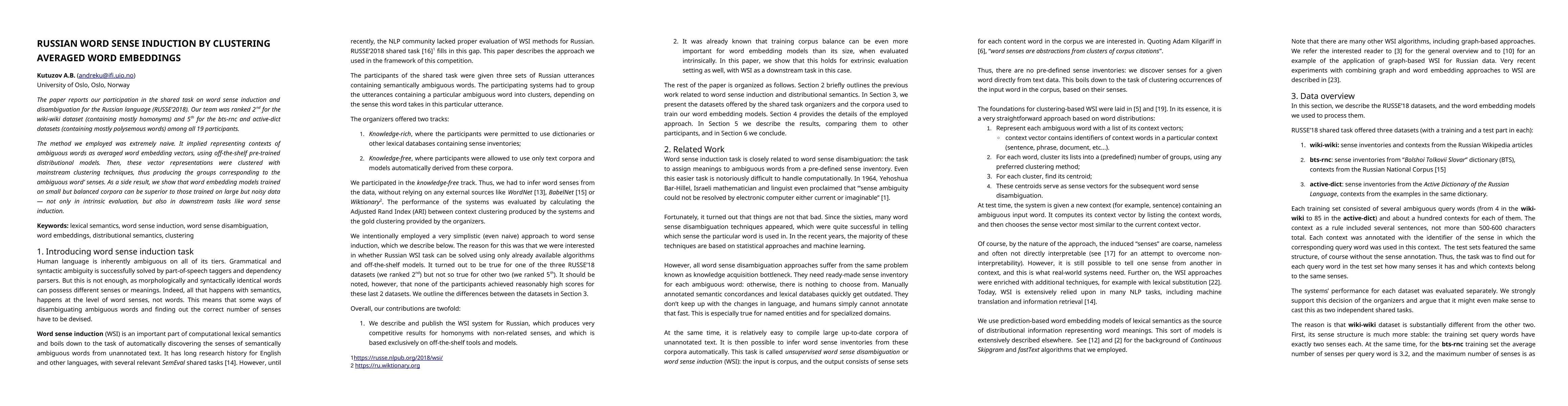 The paper describes a simple yet effective method for Russian word sense induction using averaged word embeddings and clustering, achieving 2nd place in the homonym dataset and 5th in polysemous datasets at the RUSSE-2018 shared task. It also highlights that small, balanced corpora can outperform large, noisy datasets in both intrinsic and downstream tasks.