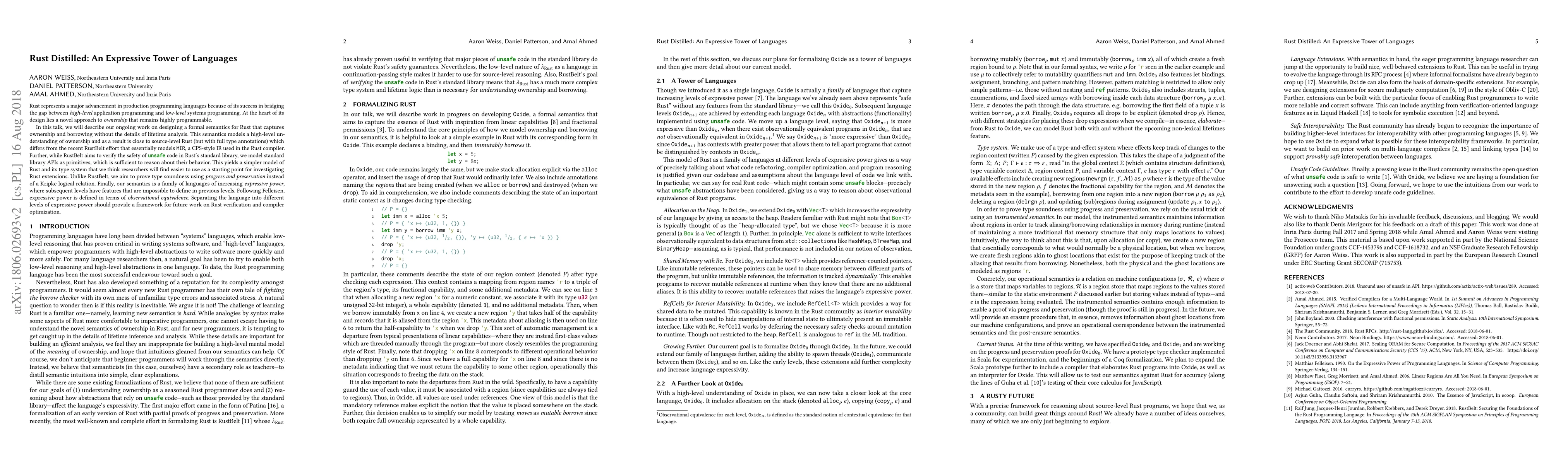 Rust represents a major advancement in production programming languages because of its success in bridging the gap between high-level application programming and low-level systems programming. At the heart of its design lies a novel approach to ownership that remains highly programmable. In this talk, we will describe our ongoing work on designing a formal semantics for Rust that captures ownership and borrowing without the details of lifetime analysis. This semantics models a high-level understanding of ownership and as a result is close to source-level Rust (but with full type annotations) which differs from the recent RustBelt effort that essentially models MIR, a CPS-style IR used in the Rust compiler. Further, while RustBelt aims to verify the safety of unsafe code in Rust's standard library, we model standard library APIs as primitives, which is sufficient to reason about their behavior. This yields a simpler model of Rust and its type system that we think researchers will find easier to use as a starting point for investigating Rust extensions. Unlike RustBelt, we aim to prove type soundness using progress and preservation instead of a Kripke logical relation. Finally, our semantics is a family of languages of increasing expressive power, where subsequent levels have features that are impossible to define in previous levels. Following Felleisen, expressive power is defined in terms of observational equivalence. Separating the language into different levels of expressive power should provide a framework for future work on Rust verification and compiler optimization.