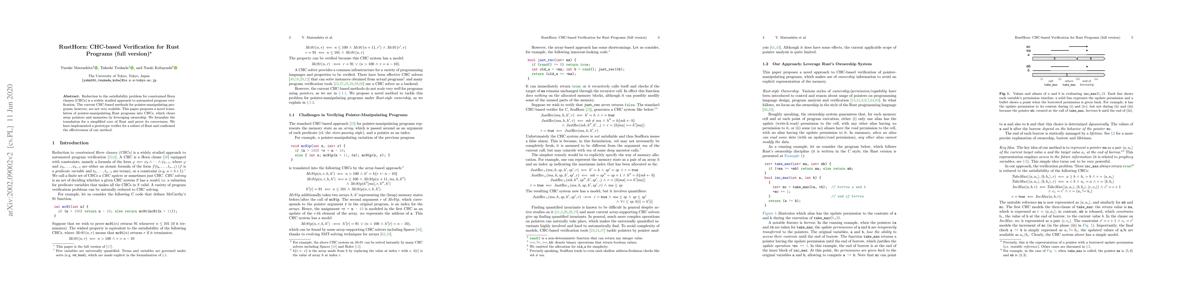 This paper introduces RustHorn, a novel CHC-based verifier for Rust programs that translates Rust's pointer-manipulating constructs into constrained Horn clauses, leveraging Rust's ownership features for scalability. The authors prove the translation's correctness and demonstrate the effectiveness of their prototype verifier.