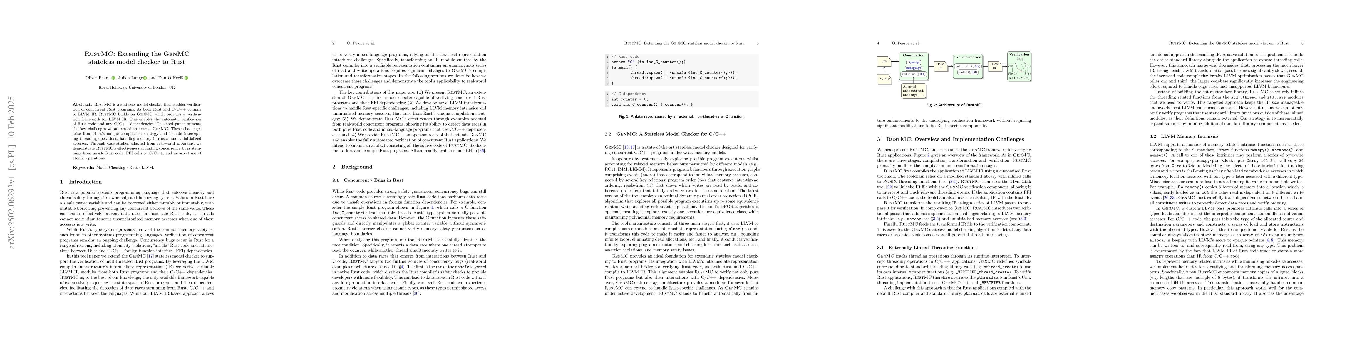 RustMC extends GenMC to handle Rust's compilation characteristics, enabling automatic verification of Rust code and C/C++ dependencies by intercepting threading operations, handling memory intrinsics, and uninitialized accesses.