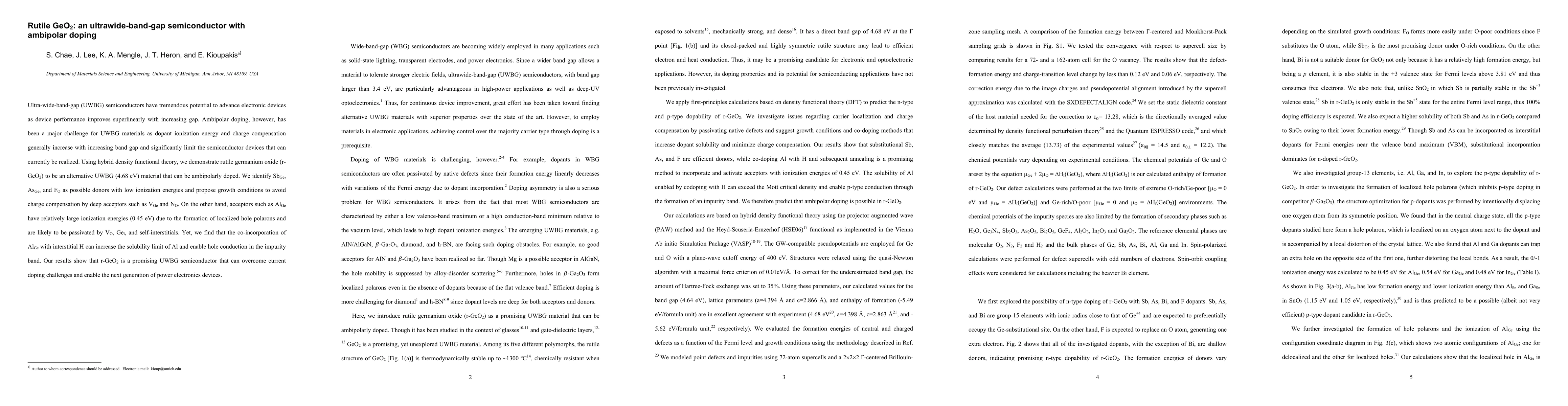 This paper demonstrates that rutile germanium oxide (r-GeO2) is a promising ultra-wide-band-gap (UWBG) semiconductor with potential for ambipolar doping, overcoming challenges faced by other UWBG materials. The study identifies suitable low-energy donors and proposes methods to enhance hole conduction, suggesting r-GeO2 could enable advanced power electronics.