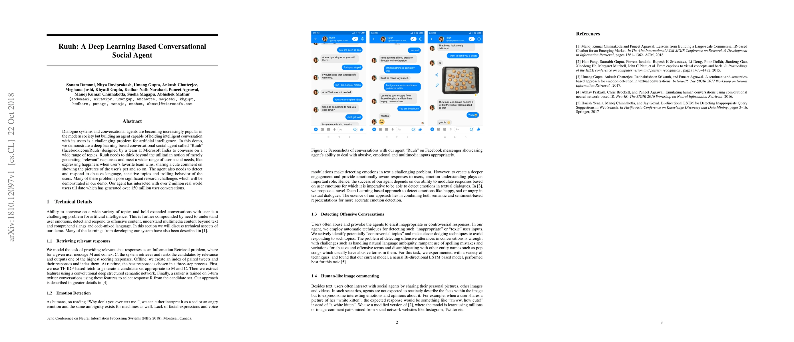Dialogue systems and conversational agents are becoming increasingly popular in the modern society but building an agent capable of holding intelligent conversation with its users is a challenging problem for artificial intelligence. In this demo, we demonstrate a deep learning based conversational social agent called "Ruuh" (facebook.com/Ruuh) designed by a team at Microsoft India to converse on a wide range of topics. Ruuh needs to think beyond the utilitarian notion of merely generating "relevant" responses and meet a wider range of user social needs, like expressing happiness when user's favorite team wins, sharing a cute comment on showing the pictures of the user's pet and so on. The agent also needs to detect and respond to abusive language, sensitive topics and trolling behavior of the users. Many of these problems pose significant research challenges which will be demonstrated in our demo. Our agent has interacted with over 2 million real world users till date which has generated over 150 million user conversations.