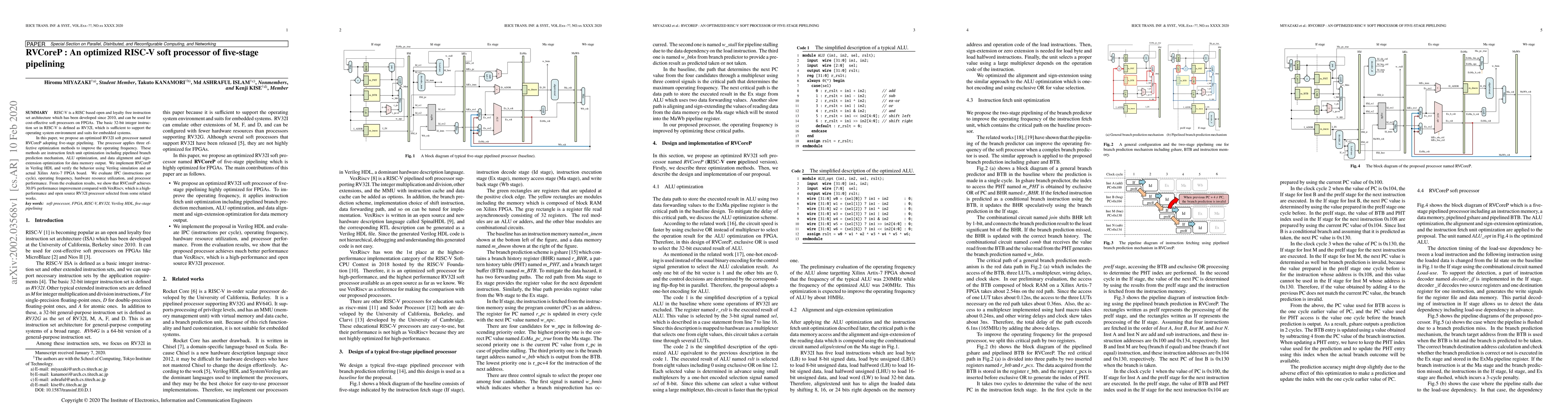 This paper proposes an optimized RISC-V soft processor named RVCoreP, utilizing five-stage pipelining and three optimization methods for improved performance. Implemented in Verilog HDL and evaluated on an FPGA, RVCoreP shows a 30.0% performance boost over VexRiscv.
