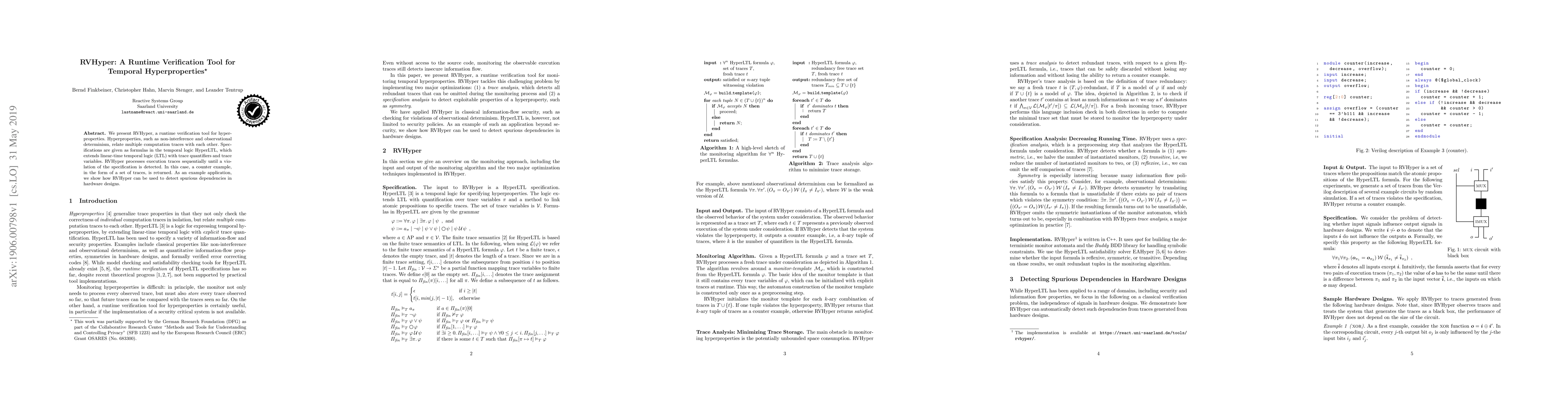 RVHyper is a runtime verification tool designed to check hyperproperties, such as non-interference, using temporal logic HyperLTL. It detects violations by processing execution traces sequentially and returns counterexamples in the form of trace sets, demonstrating its application in identifying spurious dependencies in hardware designs.