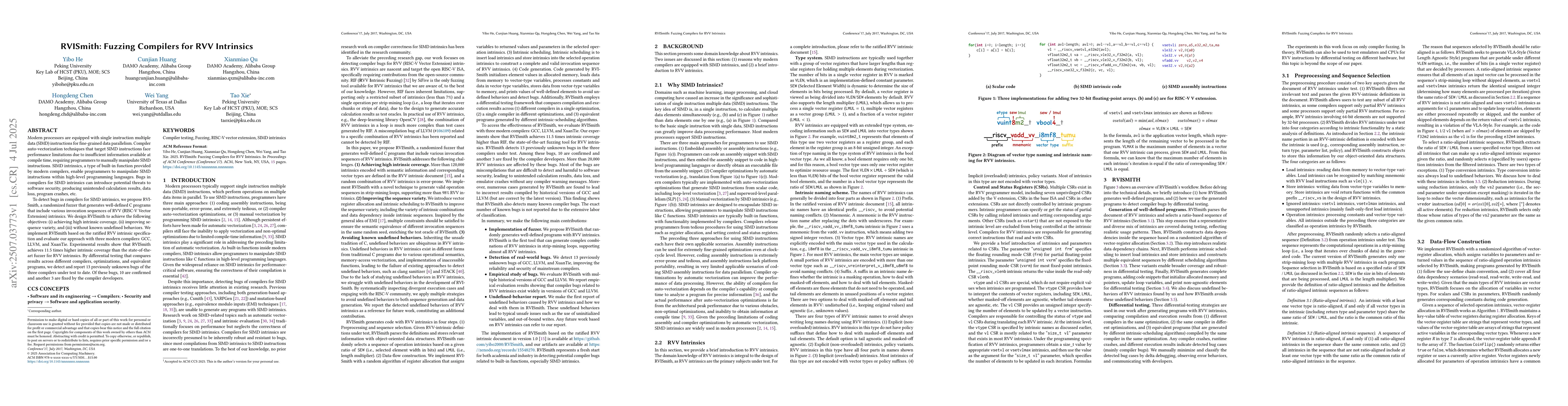 Modern processors are equipped with single instruction multiple data (SIMD) instructions for fine-grained data parallelism. Compiler auto-vectorization techniques that target SIMD instructions face performance limitations due to insufficient information available at compile time, requiring programmers to manually manipulate SIMD instructions. SIMD intrinsics, a type of built-in function provided by modern compilers, enable programmers to manipulate SIMD instructions within high-level programming languages. Bugs in compilers for SIMD intrinsics can introduce potential threats to software security, producing unintended calculation results, data loss, program crashes, etc. To detect bugs in compilers for SIMD intrinsics, we propose RVISmith, a randomized fuzzer that generates well-defined C programs that include various invocation sequences of RVV (RISC-V Vector Extension) intrinsics. We design RVISmith to achieve the following objectives: (i) achieving high intrinsic coverage, (ii) improving sequence variety, and (iii) without known undefined behaviors. We implement RVISmith based on the ratified RVV intrinsic specification and evaluate our approach with three modern compilers: GCC, LLVM, and XuanTie. Experimental results show that RVISmith achieves 11.5 times higher intrinsic coverage than the state-of-the-art fuzzer for RVV intrinsics. By differential testing that compares results across different compilers, optimizations, and equivalent programs, we detect and report 13 previously unknown bugs of the three compilers under test to date. Of these bugs, 10 are confirmed and another 3 are fixed by the compiler developers.