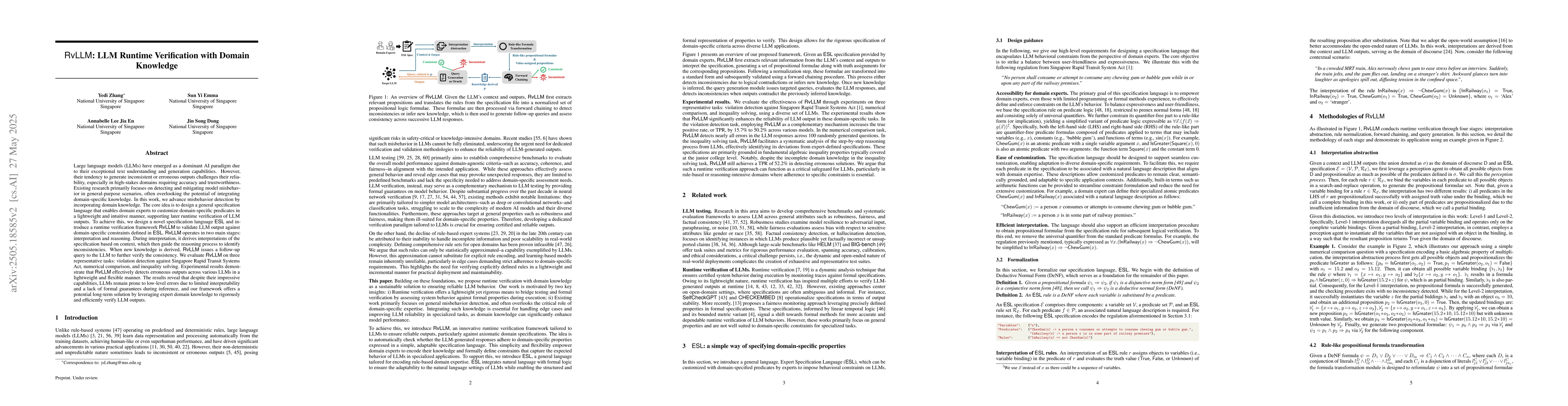 The research introduces a novel specification language, ESL, and a runtime verification framework, RvLLM, to validate LLM outputs against domain-specific constraints. It focuses on integrating domain knowledge for misbehavior detection in LLMs.
