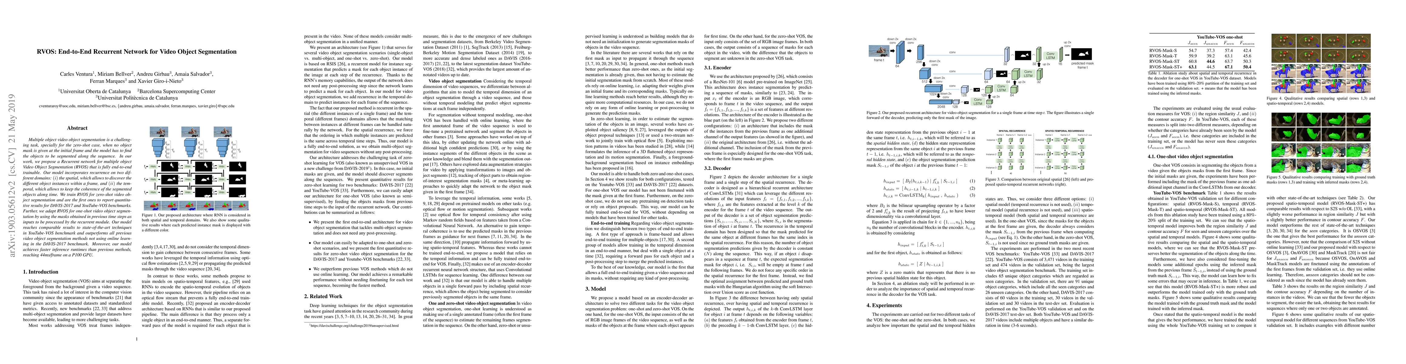 The RVOS model is an end-to-end recurrent network designed for zero-shot and one-shot video object segmentation, incorporating spatial and temporal recurrence to maintain object coherence over time. It outperforms previous methods on DAVIS-2017 and YouTube-VOS benchmarks while achieving faster inference speeds.