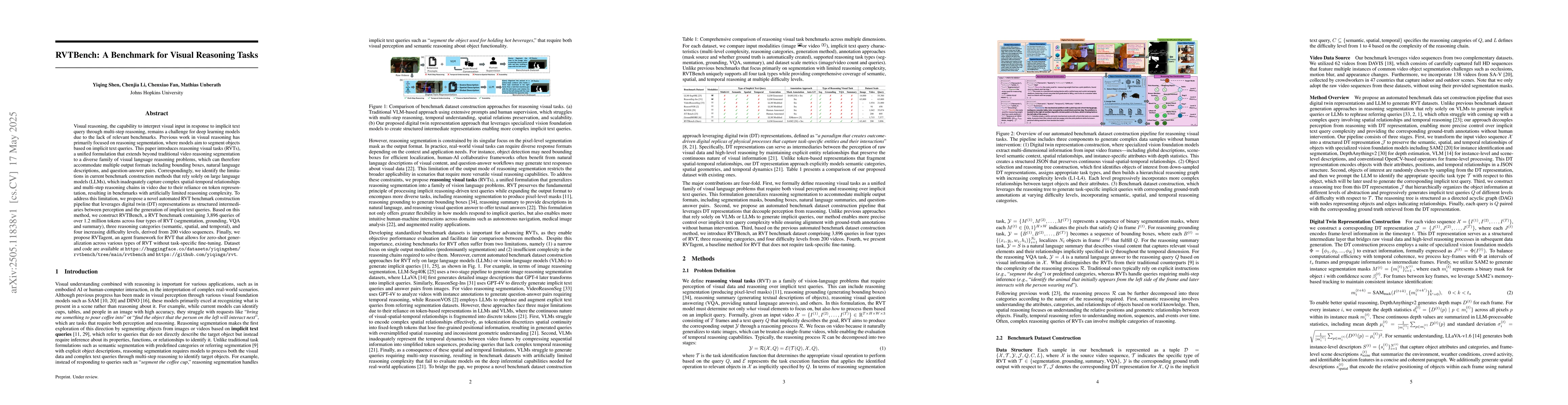 The paper introduces RVTBench, a benchmark for visual reasoning tasks (RVTs) constructed using a novel automated pipeline that leverages digital twin (DT) representations. This methodology aims to capture complex spatial-temporal relationships and multi-step reasoning chains in video, overcoming limitations of previous benchmarks reliant on large language models (LLMs).