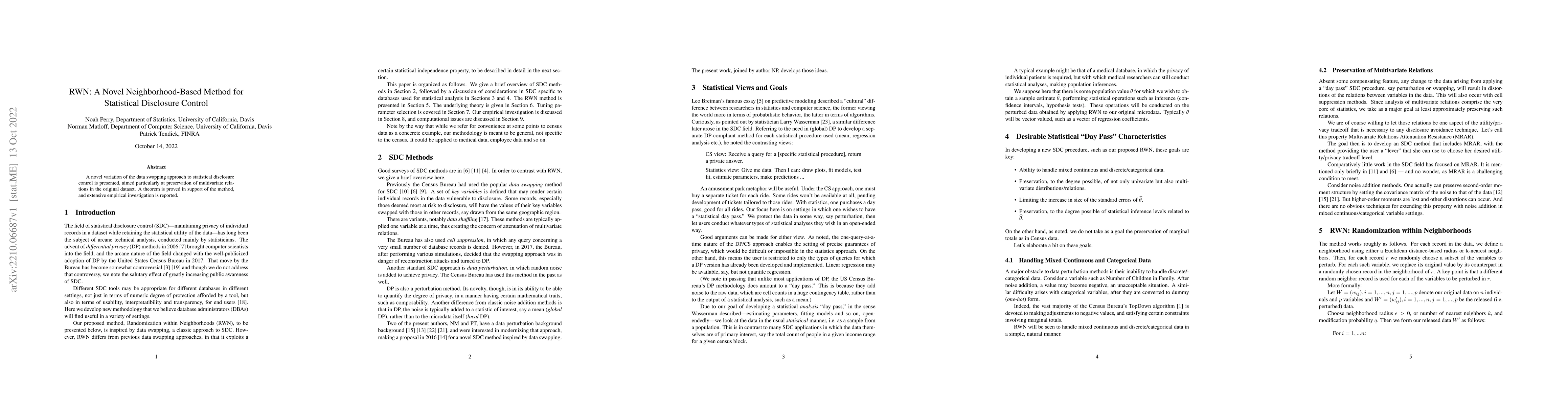 Summary: RWN introduces a novel neighborhood-based method for statistical disclosure control, preserving multivariate relations through data swapping. The method's effectiveness is supported by a theorem and validated through extensive empirical studies.