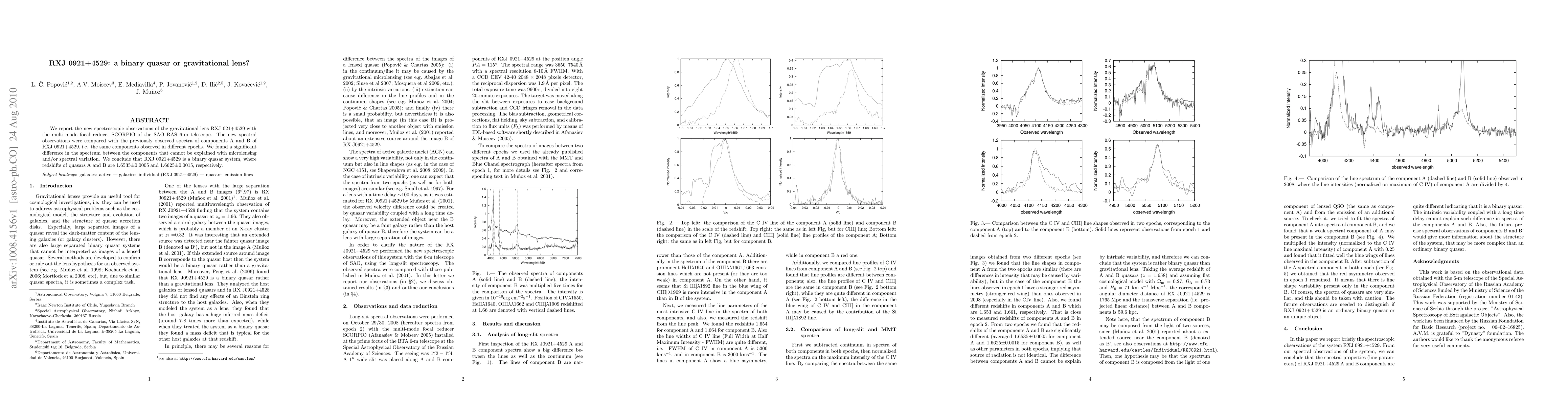 We report the new spectroscopic observations of the gravitational lens RXJ 021+4529 with the multi-mode focal reducer SCORPIO of the SAO RAS 6-m telescope. The new spectral observations were compared with the previously observed spectra of components A and B of RXJ 0921+4529, i.e. the same components observed in different epochs. We found a significant difference in the spectrum between the components that cannot be explained with microlensing and/or spectral variation. We conclude that RXJ 0921+4529 is a binary quasar system, where redshifts of quasars A and B are 1.6535 +/- 0.0005 and 1.6625 +/- 0.0015, respectively.