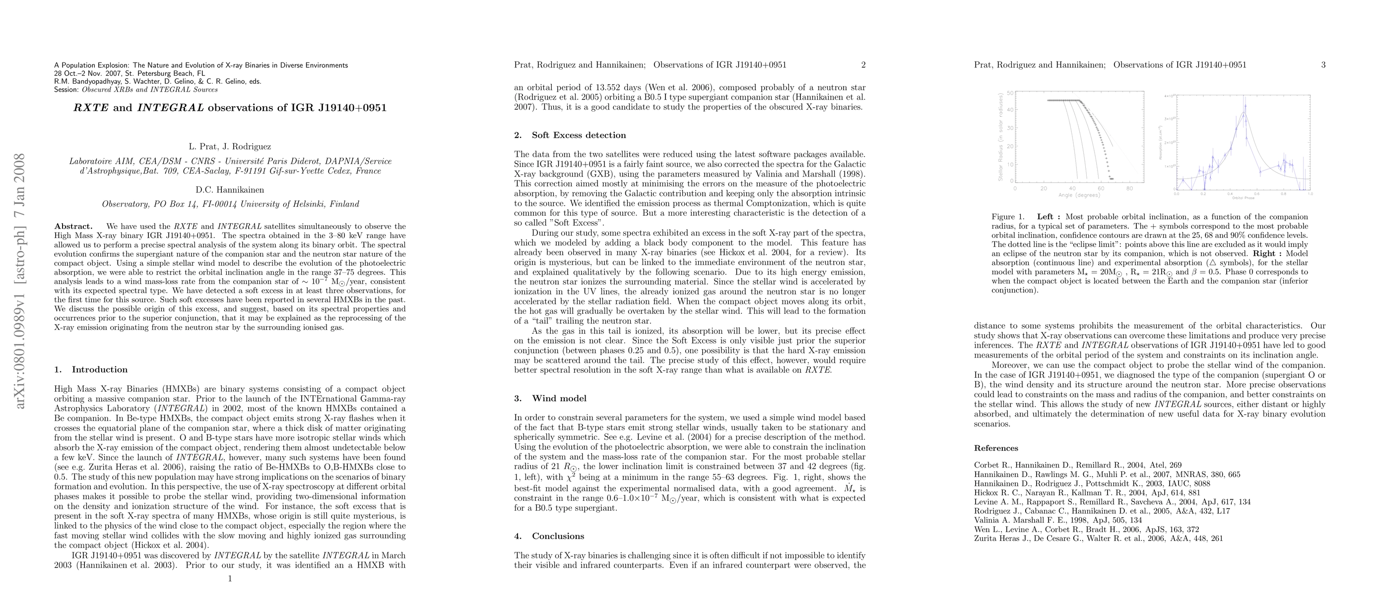 We have used the RXTE and INTEGRAL satellites simultaneously to observe the High Mass X-ray binary IGR J19140+0951. The spectra obtained in the 3-80 keV range have allowed us to perform a precise spectral analysis of the system along its binary orbit. The spectral evolution confirms the supergiant nature of the companion star and the neutron star nature of the compact object. Using a simple stellar wind model to describe the evolution of the photoelectric absorption, we were able to restrict the orbital inclination angle in the range 37-75 degrees. This analysis leads to a wind mass-loss rate from the companion star of ~ 10e-7 Msun/year, consistent with its expected spectral type. We have detected a soft excess in at least three observations, for the first time for this source. Such soft excesses have been reported in several HMXBs in the past. We discuss the possible origin of this excess, and suggest, based on its spectral properties and occurrences prior to the superior conjunction, that it may be explained as the reprocessing of the X-ray emission originating from the neutron star by the surrounding ionised gas.