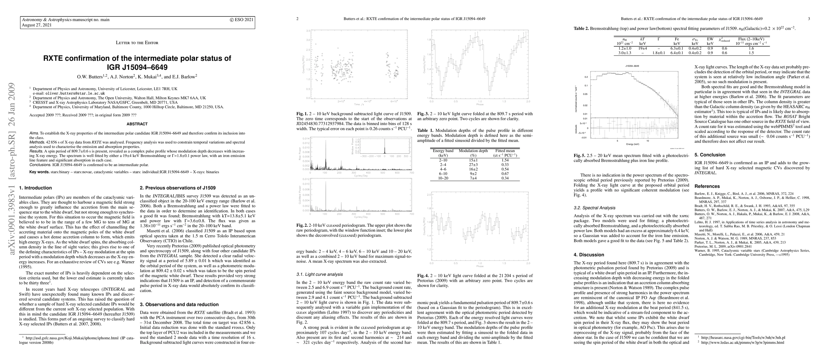 This study confirms IGR J15094-6649 as an intermediate polar using RXTE data, revealing a spin period of 809.7±0.6 s and a spectrum consistent with either a Bremsstrahlung or power law model, with significant absorption features.