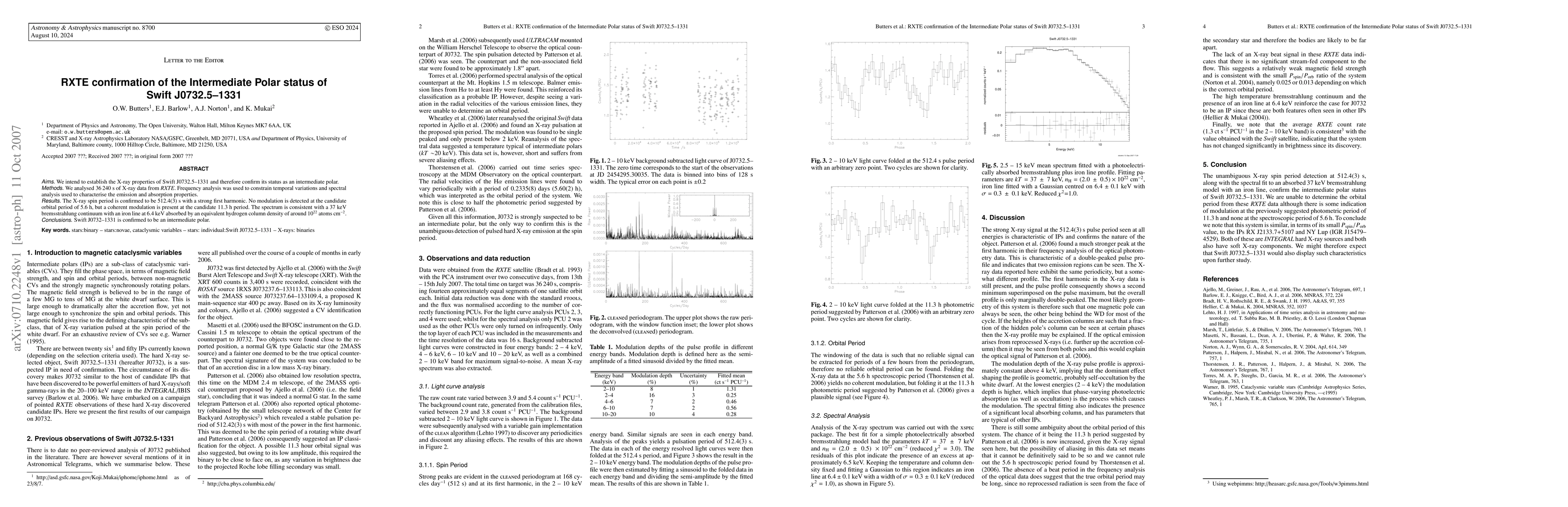The paper presents a detailed analysis of Swift J0732-1331's X-ray properties, confirming its intermediate polar status through RXTE observations and providing a comprehensive characterization of its emission and absorption features.