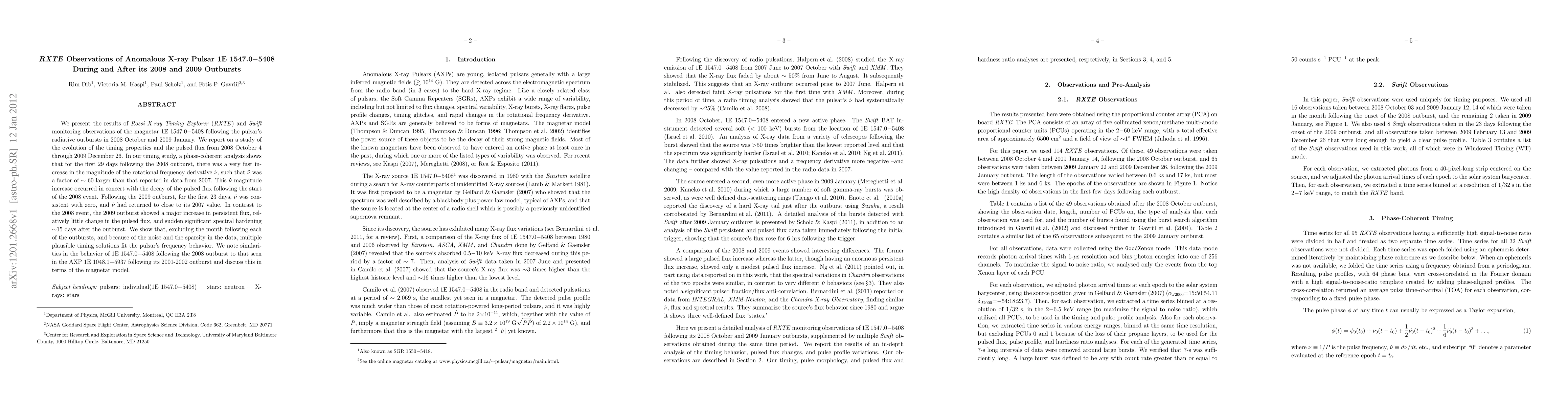 The RXTE mission observed a magnetar, 1E 1547.0-5408, during and after two radiative outbursts in 2008 and 2009, revealing changes in its timing properties and pulsed flux.
