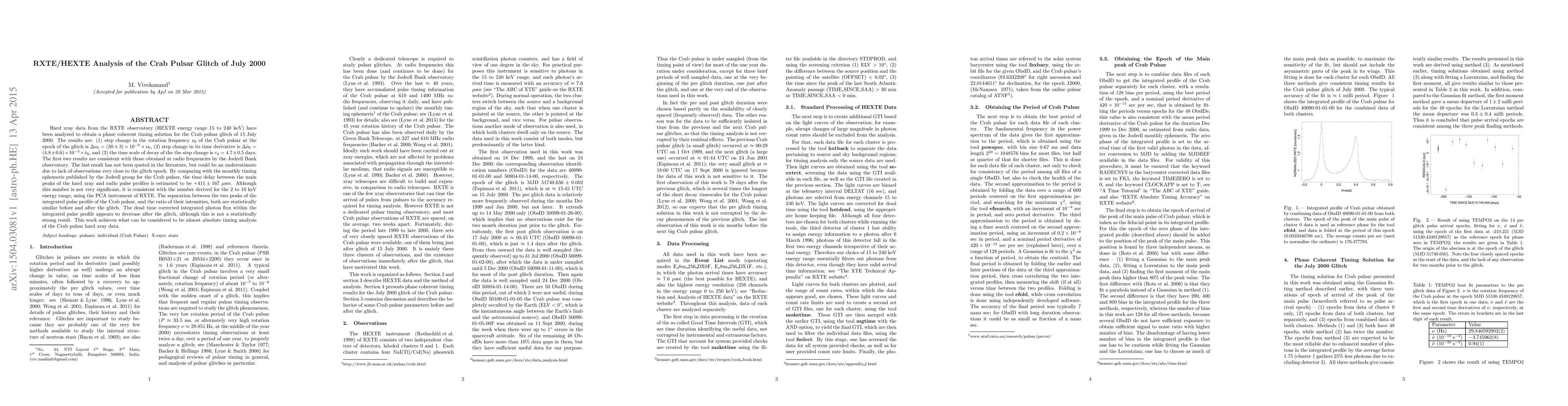 This study uses RXTE/HEXTE hard x-ray data to analyze the Crab pulsar glitch in July 2000, finding a step change in rotation frequency and its time derivative, and a decay timescale. The results are consistent with radio observations, though the decay timescale may be underestimated due to limited observations.