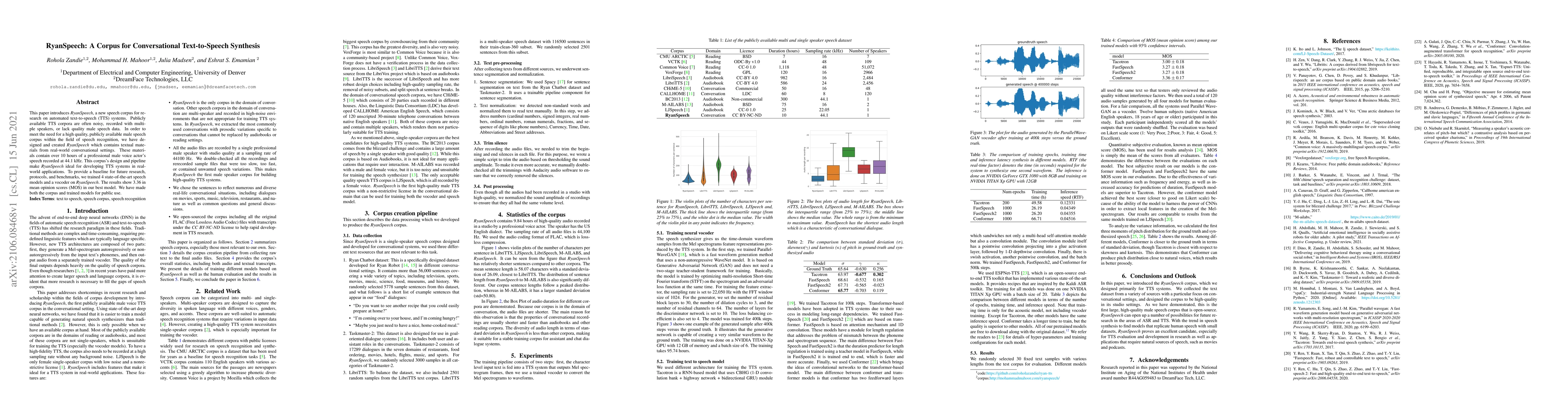 RyanSpeech is a new high-quality male speech corpus designed for text-to-speech research, featuring over 10 hours of professional male voice actor recordings. The corpus and trained models are publicly available to facilitate future TTS system development and benchmarking.