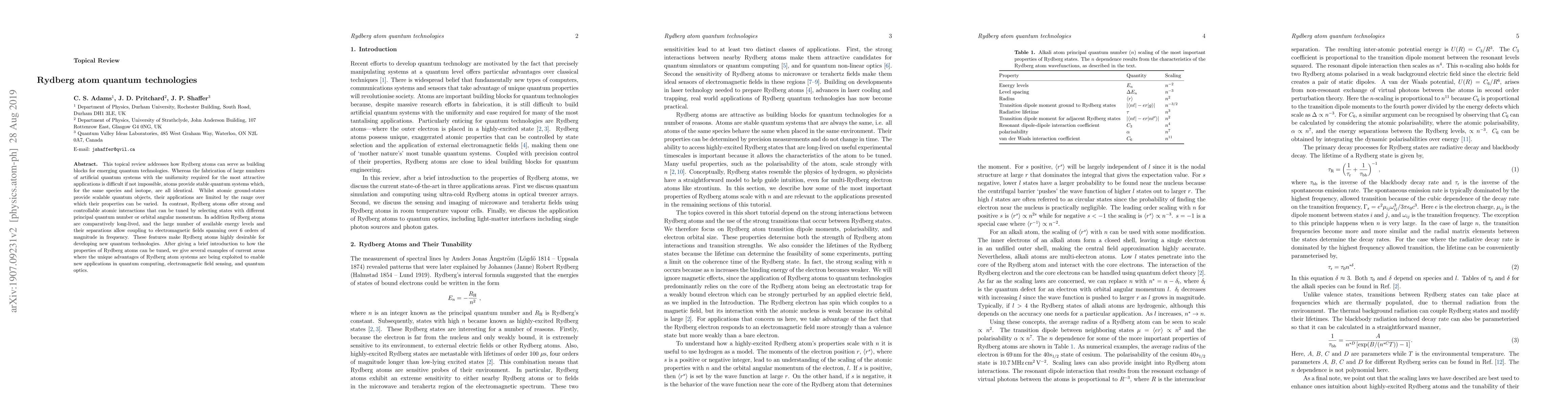 This topical review addresses how Rydberg atoms can serve as building blocks for emerging quantum technologies. Whereas the fabrication of large numbers of artificial quantum systems with the uniformity required for the most attractive applications is difficult if not impossible, atoms provide stable quantum systems which, for the same species and isotope, are all identical. Whilst atomic ground-states provide scalable quantum objects, their applications are limited by the range over which their properties can be varied. In contrast, Rydberg atoms offer strong and controllable atomic interactions that can be tuned by selecting states with different principal quantum number or orbital angular momentum. In addition Rydberg atoms are comparatively long-lived, and the large number of available energy levels and their separations allow coupling to electromagnetic fields spanning over 6 orders of magnitude in frequency. These features make Rydberg atoms highly desirable for developing new quantum technologies. After giving a brief introduction to how the properties of Rydberg atoms can be tuned, we give several examples of current areas where the unique advantages of Rydberg atom systems are being exploited to enable new applications in quantum computing, electromagnetic field sensing, and quantum optics.