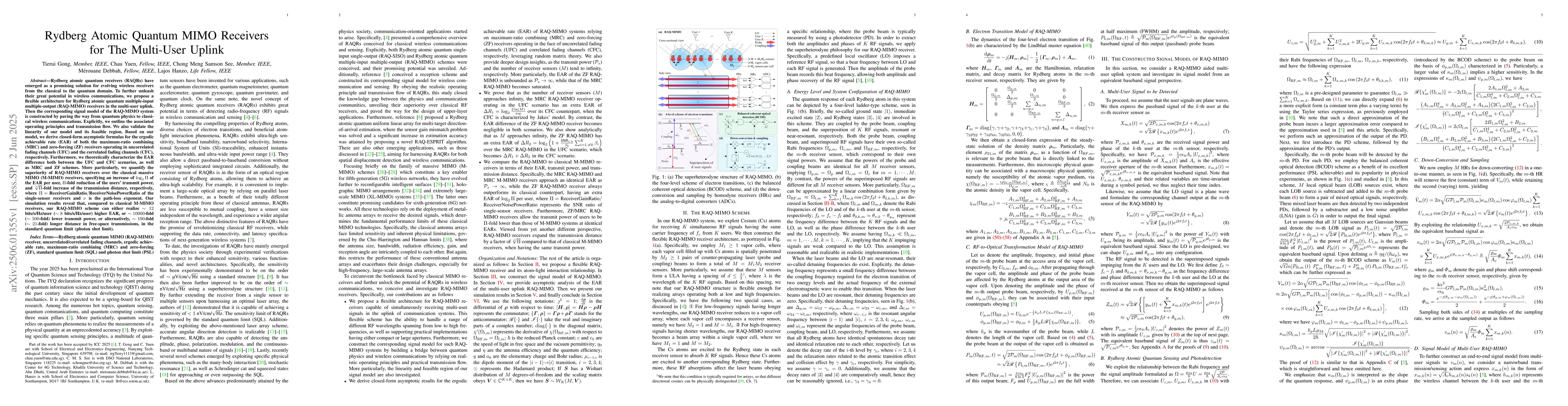 The paper proposes a flexible architecture for Rydberg atomic quantum multiple-input multiple-output (RAQ-MIMO) receivers, constructing a signal model transitioning from quantum physics to classical wireless communications. It outlines operating principles and transmission flow, validating linearity and feasible regions.