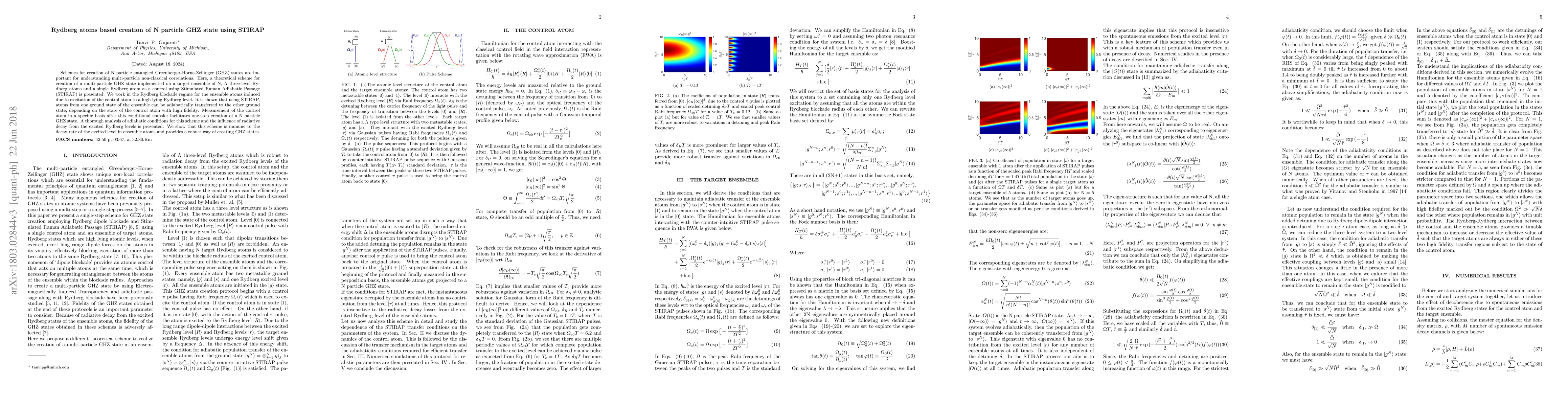 This paper proposes a theoretical scheme for creating N-particle entangled Greenberger-Horne-Zeilinger (GHZ) states using Rydberg atoms and STIRAP, demonstrating high fidelity adiabatic transfer and robustness against radiative decay. The method leverages the Rydberg blockade regime and conditional transfer based on the control atom's state.