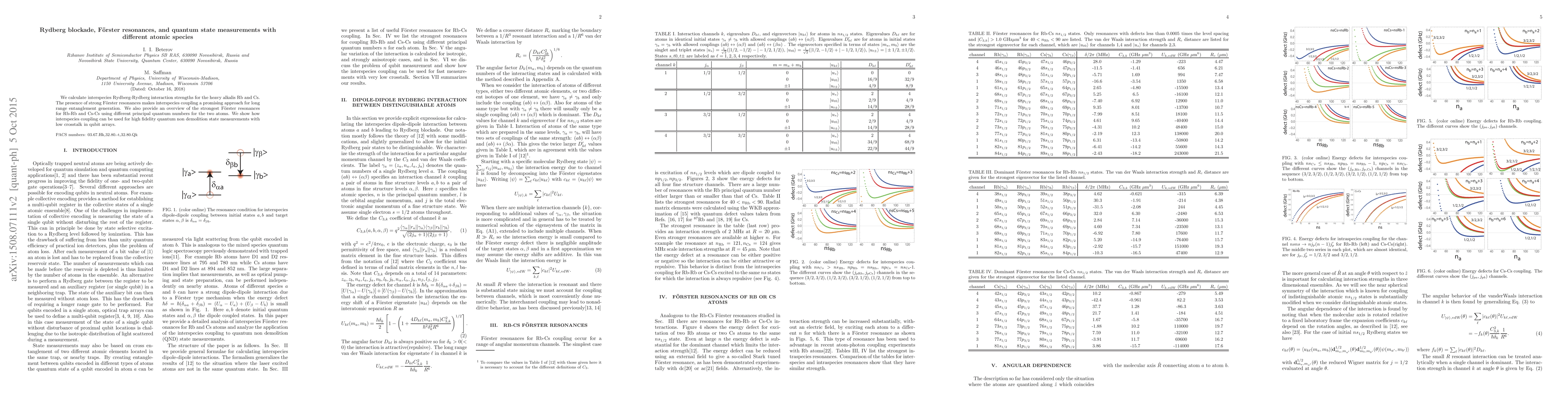 This paper investigates interspecies Rydberg-Rydberg interactions between Rb and Cs atoms, highlighting the strong F\"orster resonances that enable long-range entanglement. It also explores the application of interspecies coupling for high fidelity quantum non-demolition state measurements with minimal crosstalk in qubit arrays.