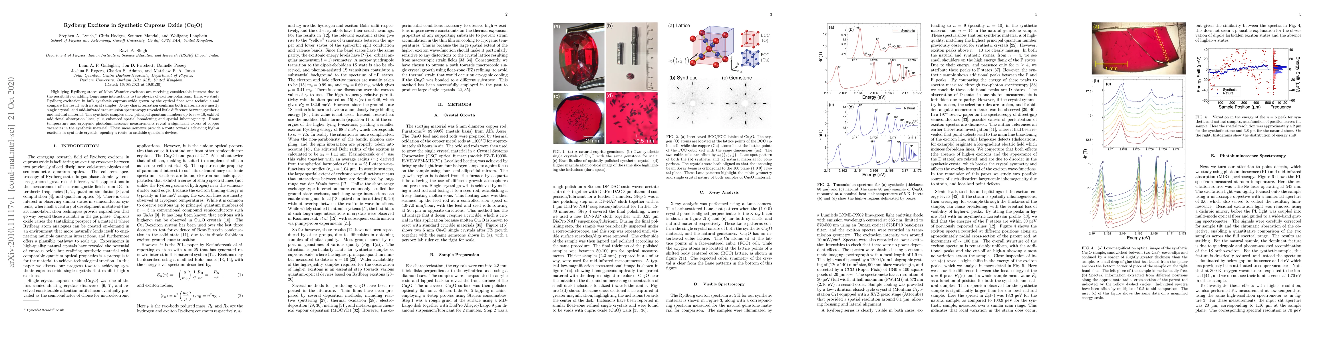 This study investigates high-lying Rydberg states in synthetic cuprous oxide grown via the optical float zone technique, revealing quantum numbers up to $n=10$ and significant excess copper vacancies. Comparisons with natural samples show minimal differences, suggesting potential for scalable quantum devices.