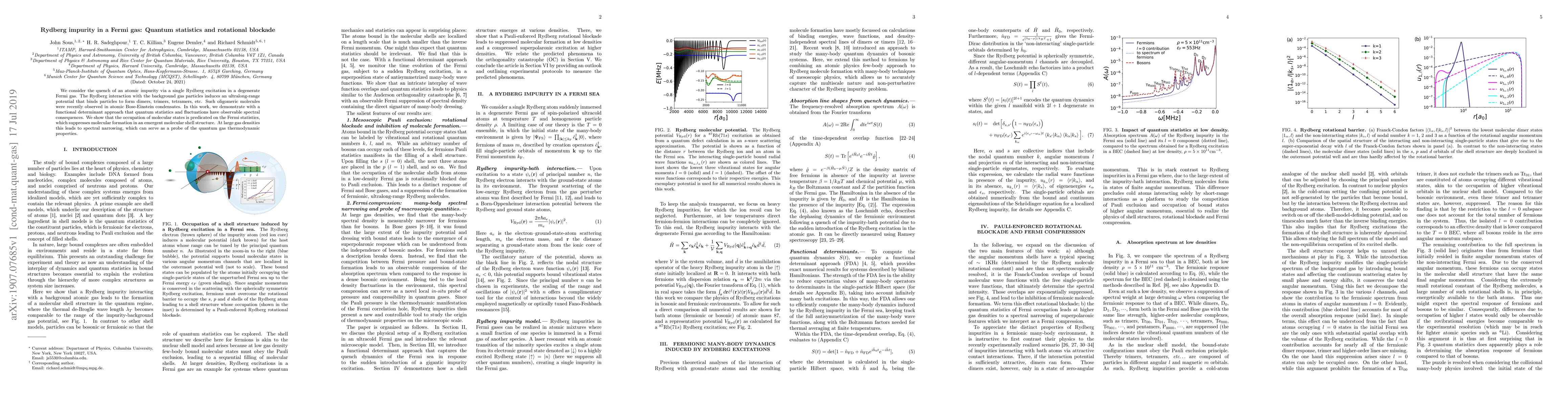 This research paper explores how a Rydberg impurity in a Fermi gas leads to the formation of molecular states with observable spectral consequences. It shows that quantum statistics suppresses molecular formation at high gas densities, leading to spectral narrowing that can be used to probe quantum gas thermodynamic properties.