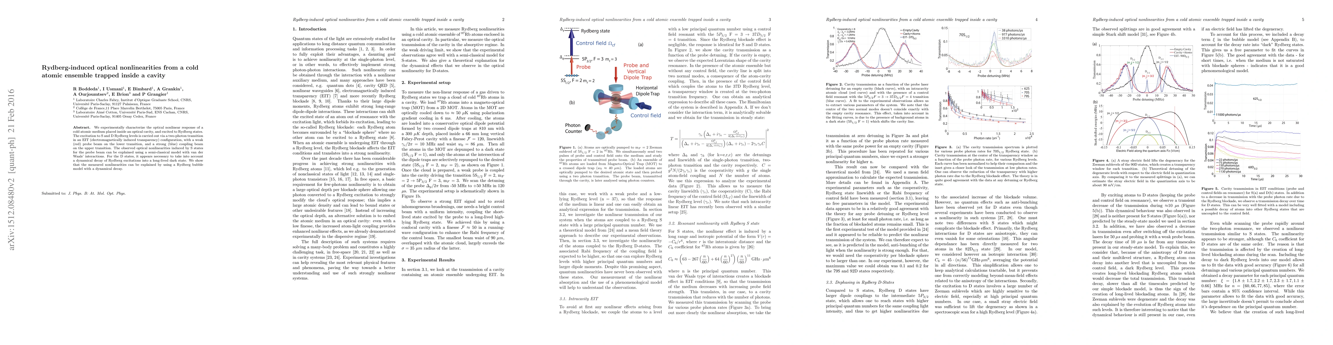This paper investigates optical nonlinearities in a cold atomic ensemble trapped in an optical cavity, excited to Rydberg states via a two-photon transition. The study finds that S states exhibit nonlinearities explained by van der Waals interactions, while D states require a dynamical decay model involving Rydberg bubbles and long-lived dark states.