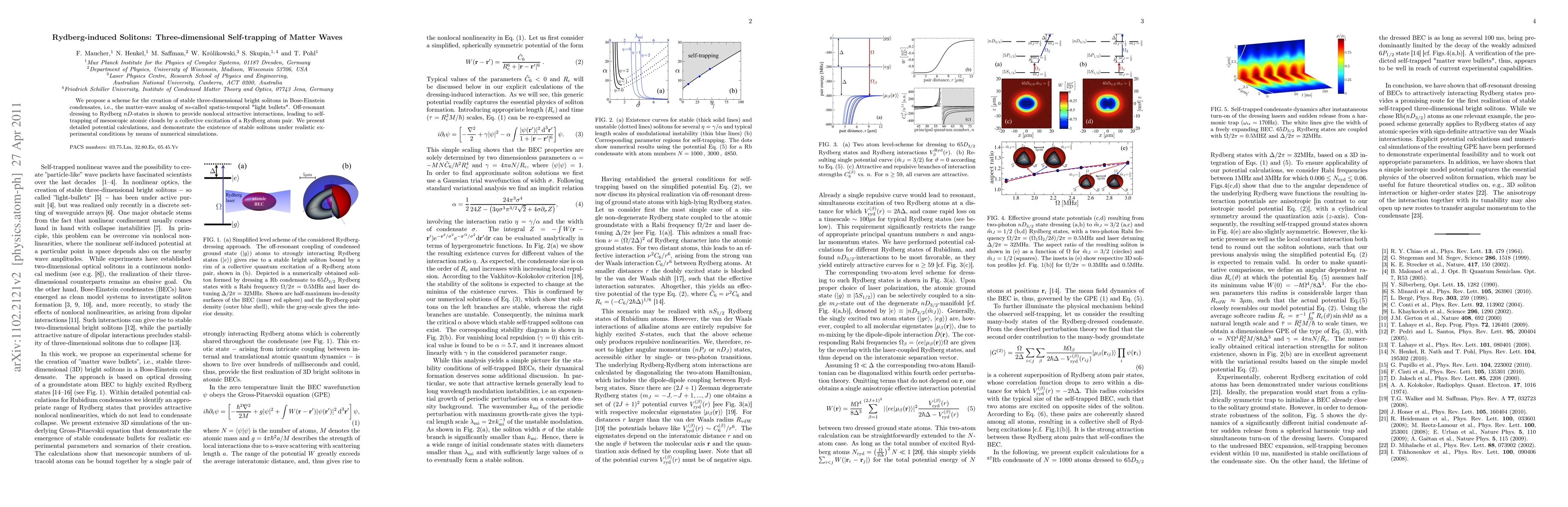 This paper proposes a method to create stable three-dimensional solitons in Bose-Einstein condensates using Rydberg-induced interactions, which self-trap matter waves through collective Rydberg excitations. Numerical simulations confirm the feasibility of these solitons under realistic experimental conditions.