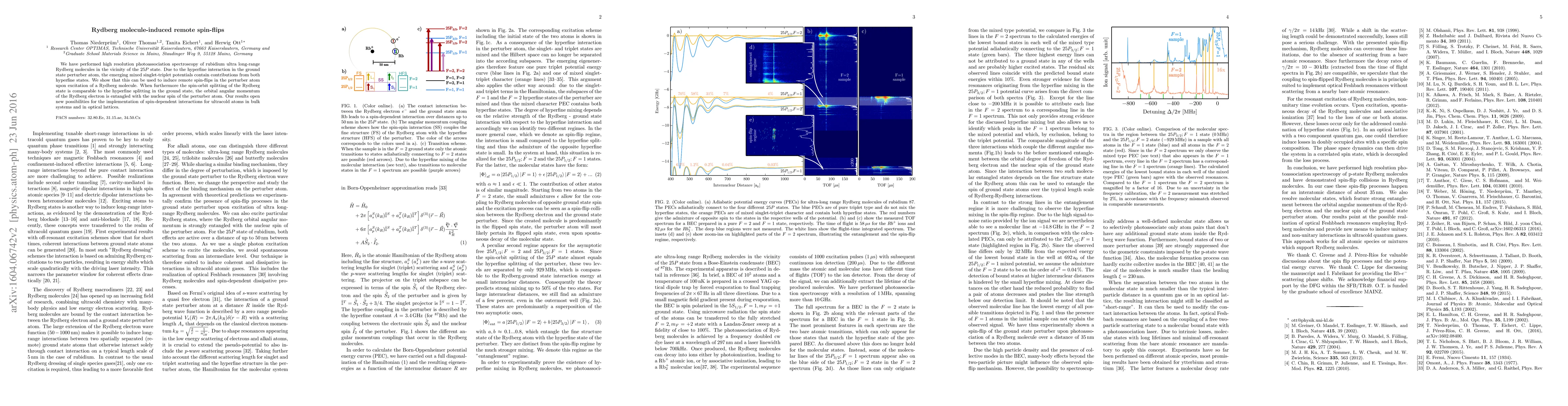 We have performed high resolution photoassociation spectroscopy of rubidium ultra long-range Rydberg molecules in the vicinity of the 25$P$ state. Due to the hyperfine interaction in the ground state perturber atom, the emerging mixed singlet-triplet potentials contain contributions from both hyperfine states. We show that this can be used to induce remote spin-flips in the perturber atom upon excitation of a Rydberg molecule. When furthermore the spin-orbit splitting of the Rydberg state is comparable to the hyperfine splitting in the ground state, the orbital angular momentum of the Rydberg electron is entangled with the nuclear spin of the perturber atom. Our results open new possibilities for the implementation of spin-dependent interactions for ultracold atoms in bulk systems and in optical lattices.