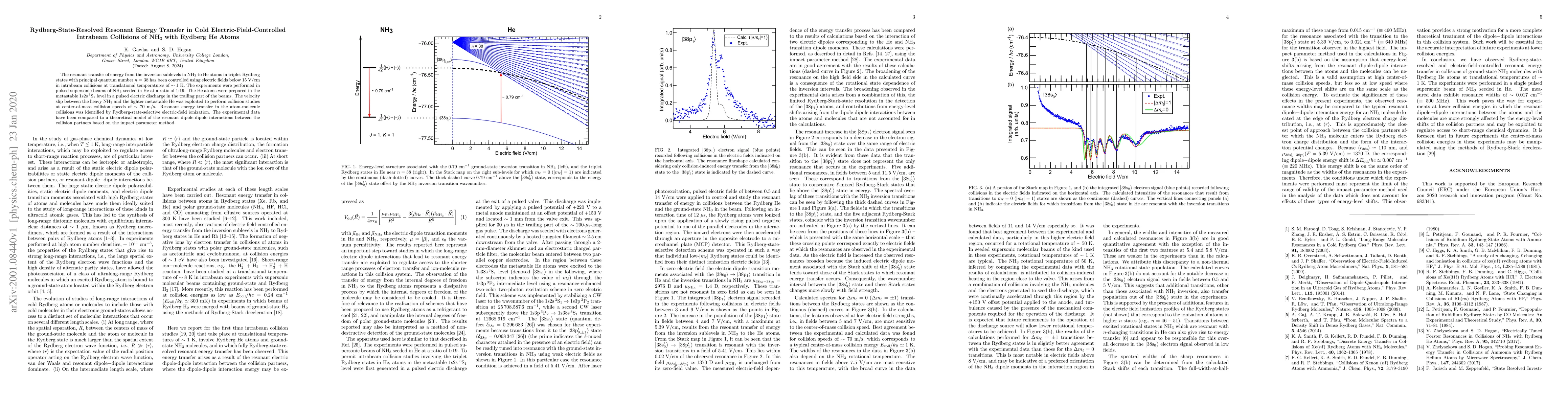 This study investigates controlled resonant energy transfer from NH$_3$ to Rydberg He atoms in intrabeam collisions at low temperatures, utilizing electric fields to manipulate the process. The experiments reveal resonant dipole-dipole interactions, validated by comparing experimental data with theoretical models.