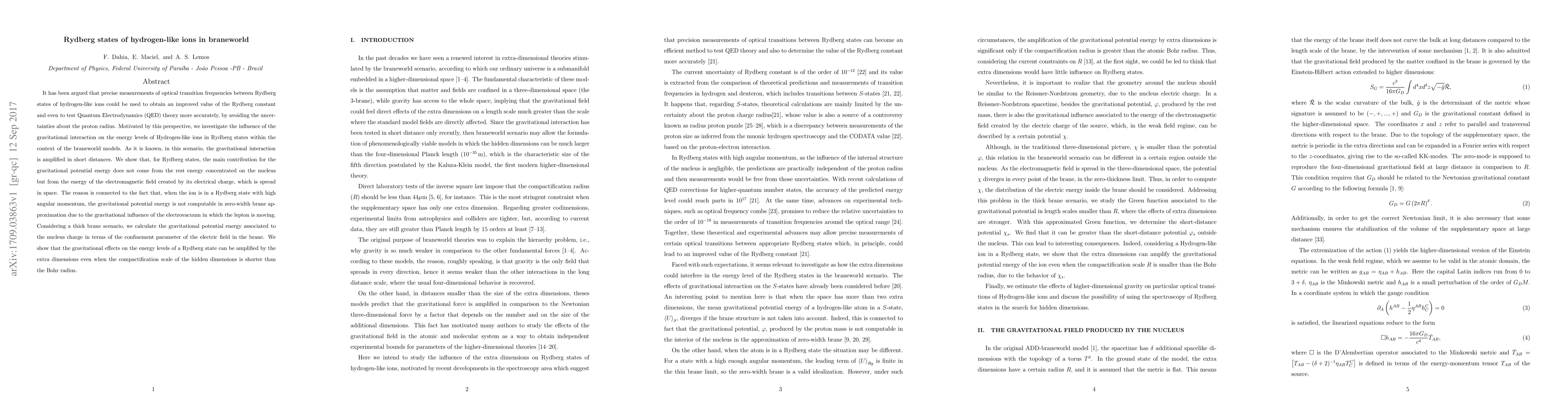 This paper explores how gravitational interactions in braneworld models affect the energy levels of Rydberg states in hydrogen-like ions. It finds that gravitational potential energy is significantly influenced by the electromagnetic field's energy rather than the nucleus's rest energy, and that the effects can be amplified by extra dimensions, potentially offering new insights into QED and the Rydberg constant.