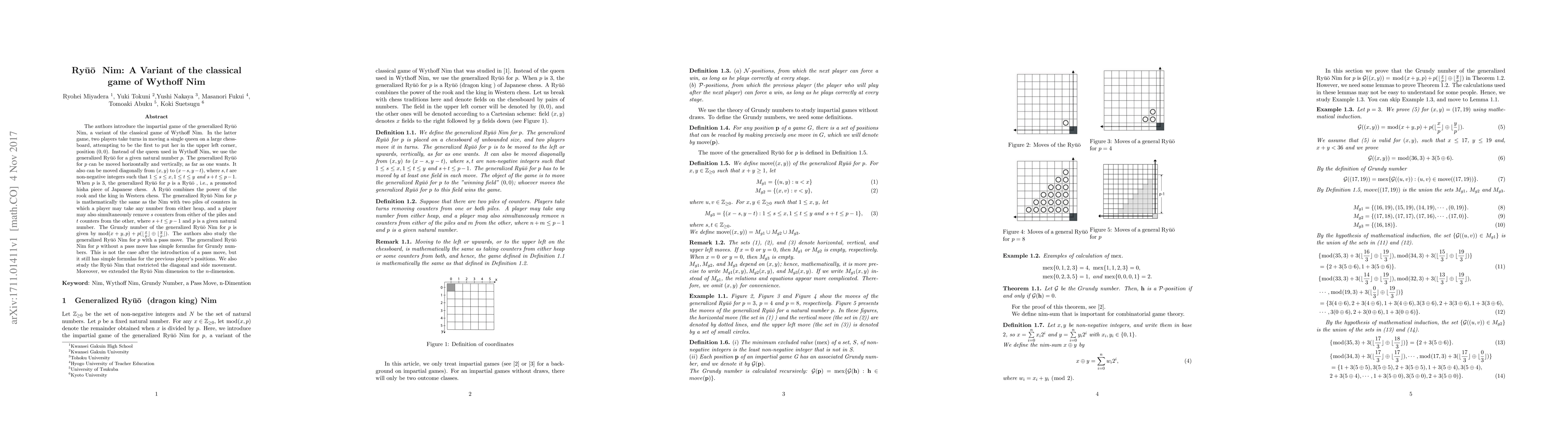 The paper introduces the generalized Ry\=u\=o Nim, a variant of Wythoff Nim where a piece moves like a Ry\=u\=o in chess, and provides formulas for its Grundy numbers. It also explores the game with and without pass moves and extends the concept to higher dimensions.