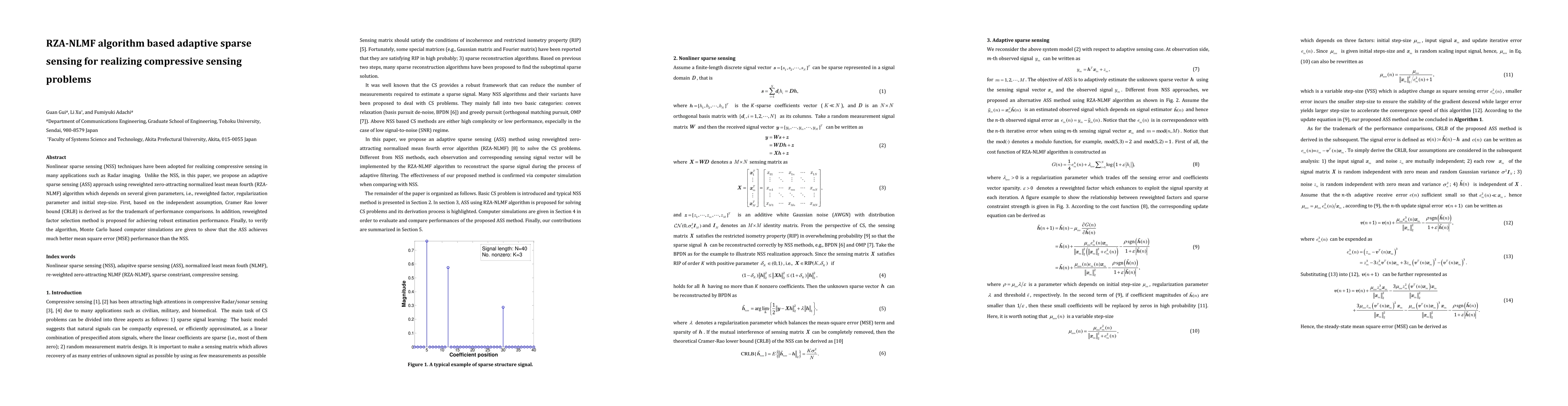 This paper proposes an adaptive sparse sensing (ASS) approach using the RZA-NLMF algorithm for compressive sensing applications, achieving better mean square error (MSE) performance compared to nonlinear sparse sensing (NSS) techniques. The algorithm incorporates parameters like reweighted factor and regularization parameter, and simulations demonstrate its superior performance.