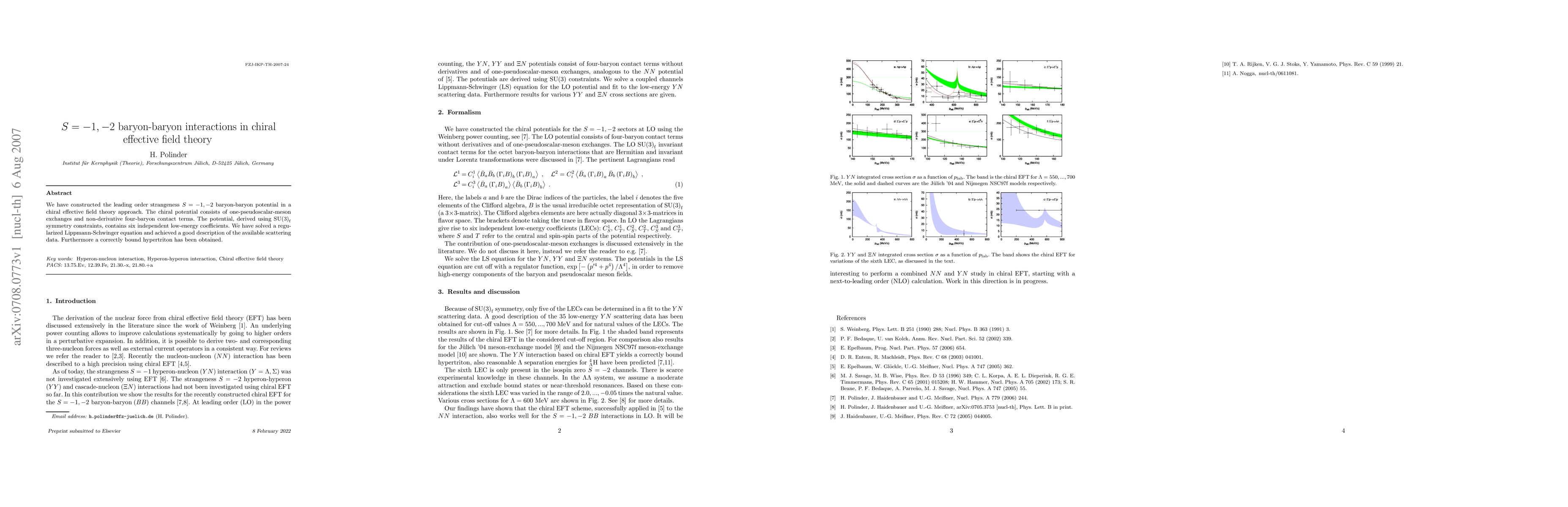 This paper constructs a leading order chiral potential for S=-1,-2 baryon-baryon interactions, incorporating one-pseudoscalar-meson exchanges and non-derivative four-baryon contact terms. The model accurately describes available scattering data and predicts a correctly bound hypertriton.