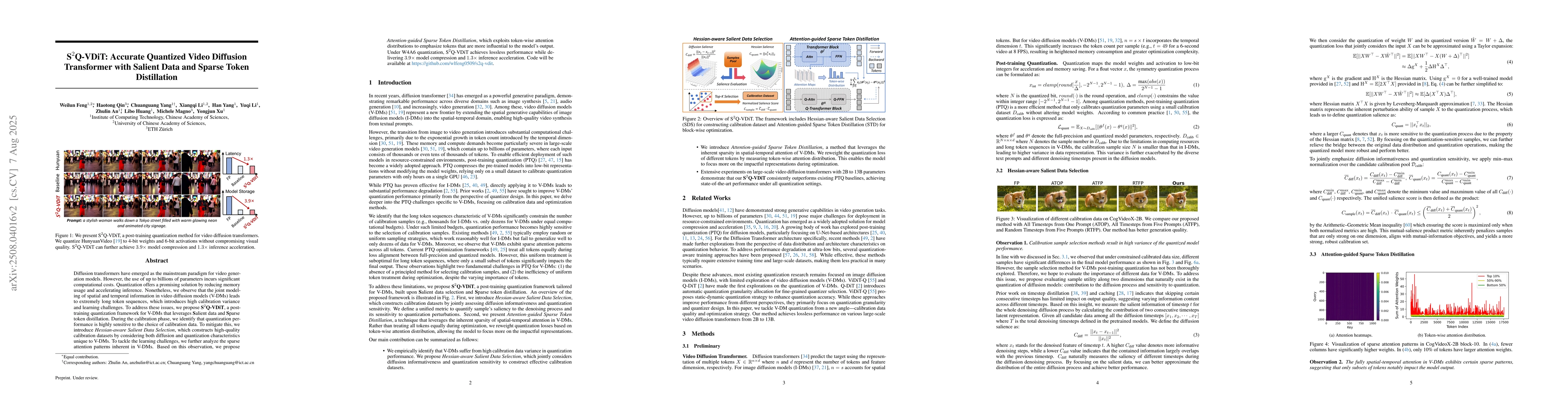 Diffusion transformers have emerged as the mainstream paradigm for video generation models. However, the use of up to billions of parameters incurs significant computational costs. Quantization offers a promising solution by reducing memory usage and accelerating inference. Nonetheless, we observe that the joint modeling of spatial and temporal information in video diffusion models (V-DMs) leads to extremely long token sequences, which introduces high calibration variance and learning challenges. To address these issues, we propose S$^2$Q-VDiT, a post-training quantization framework for V-DMs that leverages Salient data and Sparse token distillation. During the calibration phase, we identify that quantization performance is highly sensitive to the choice of calibration data. To mitigate this, we introduce \textit{Hessian-aware Salient Data Selection}, which constructs high-quality calibration datasets by considering both diffusion and quantization characteristics unique to V-DMs. To tackle the learning challenges, we further analyze the sparse attention patterns inherent in V-DMs. Based on this observation, we propose \textit{Attention-guided Sparse Token Distillation}, which exploits token-wise attention distributions to emphasize tokens that are more influential to the model's output. Under W4A6 quantization, S$^2$Q-VDiT achieves lossless performance while delivering $3.9\times$ model compression and $1.3\times$ inference acceleration. Code will be available at https://github.com/wlfeng0509/s2q-vdit.