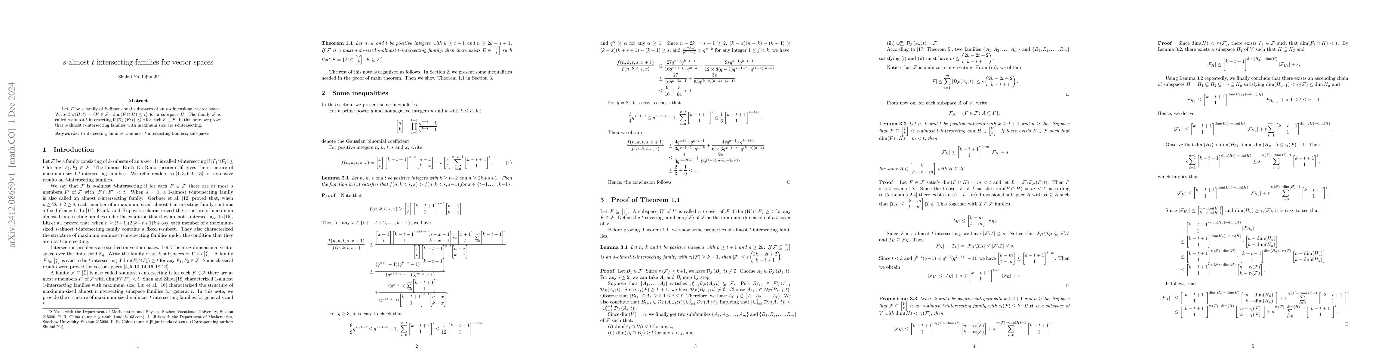 Let $\mathcal{F}$ be a family of $k$-dimensional subspaces of an $n$-dimensional vector space. Write $\mathcal{D}_{\mathcal{F}}(H;t)=\{F\in \mathcal{F}\colon \dim(F\cap H)\leq t \}$ for a subspace $H$. The family $\mathcal{F}$ is called $s$-almost $t$-intersecting if $|\mathcal{D}_{\mathcal{F}}(F;t)|\leq s$ for each $F\in \mathcal{F}$. In this note, we prove that $s$-almost $t$-intersecting families with maximum size are $t$-intersecting.