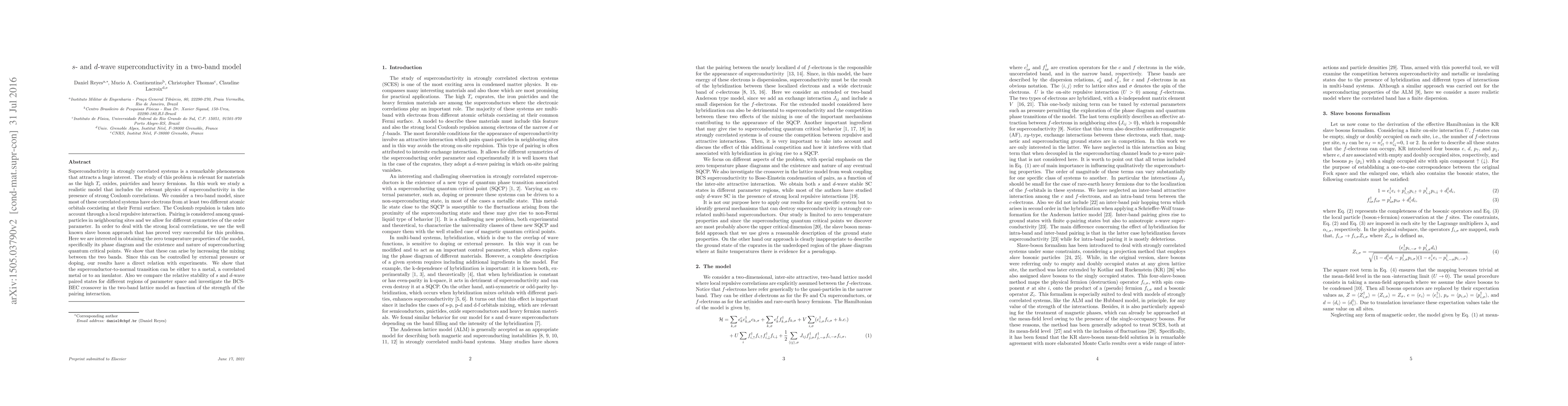 This paper investigates s- and d-wave superconductivity in a two-band model for strongly correlated systems, using the slave boson approach to account for strong local interactions. It explores the phase diagram and superconducting quantum critical points, showing that transitions can lead to metals, correlated metals, or insulators, and compares the stability of different pairing symmetries.